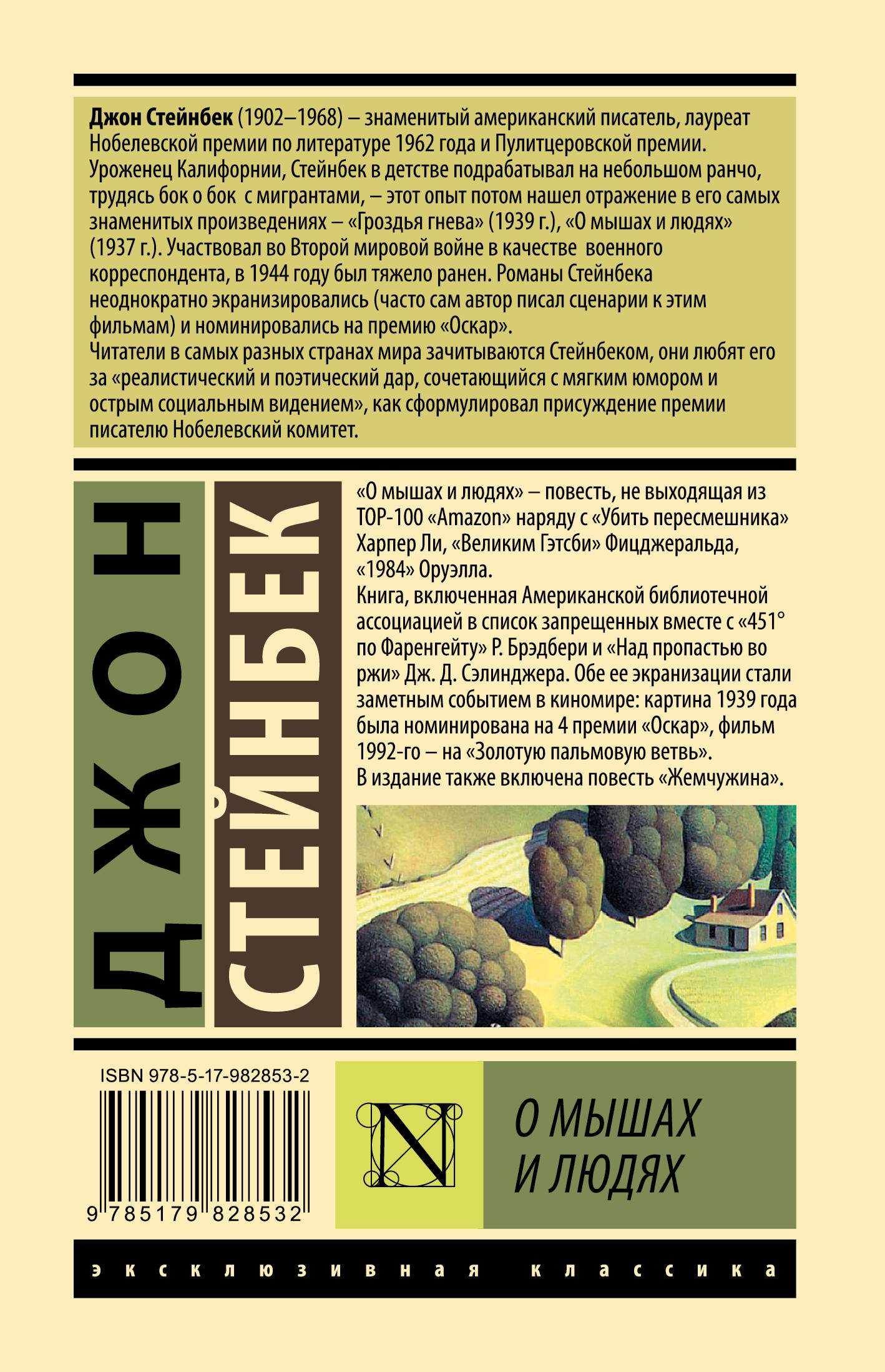 "О мышах и людях" - повесть, не выходящая из ТОР-100 "Amazon", наряду с "Убить пересмешника" Харпер Ли, "Великим Гэтсби" Фицджеральда, "1984" Оруэлла. Книга, включенная Американской библиотечной ассоциацией в список запрещенных вместе с "451° по Фаренгейту" Р. Брэдбери "Над пропастью во ржи" Дж.Д. Сэлинджера. Обе ее экранизации стали заметным событием в киномире: картина 1939 года была номинирована на 4 премии "Оскар", фильм 1992-го - на "Золотую пальмовую ветвь". В издание также включена повесть "Жемчужина".| Издательство | ИЗДАТЕЛЬСТВО "АСТ" |