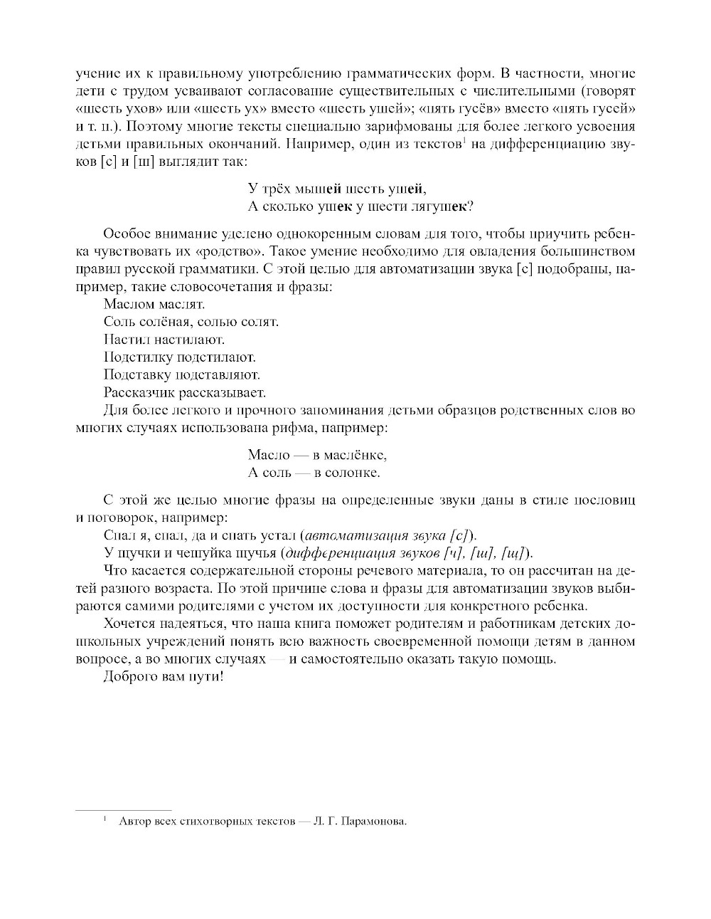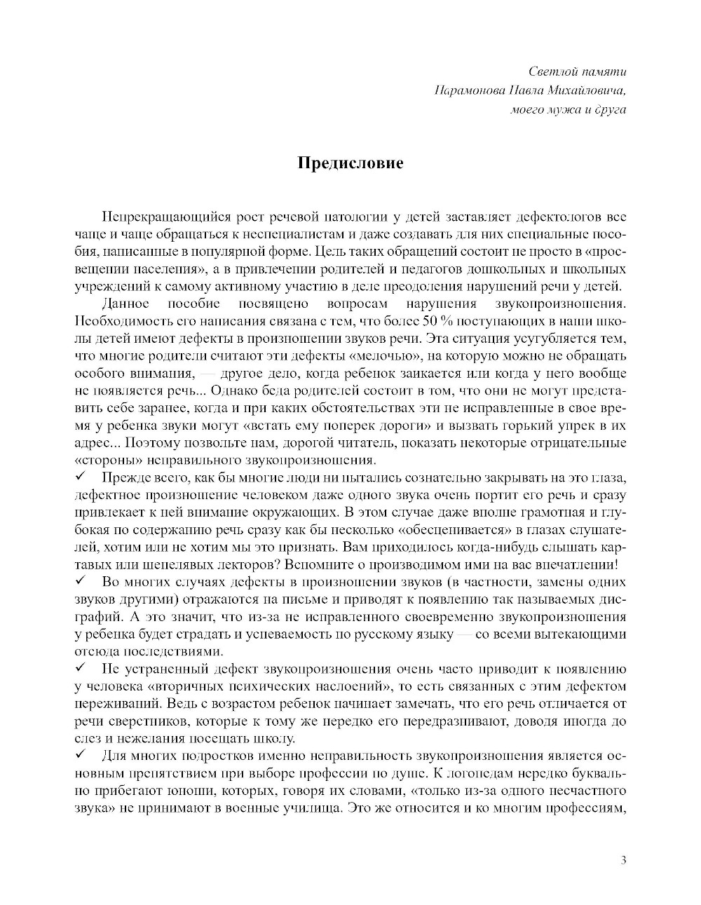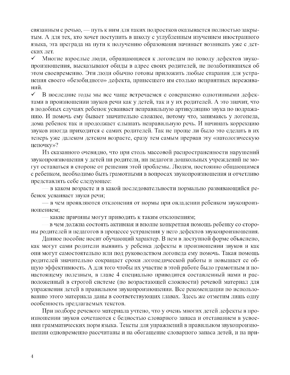 Книга посвящена широко распространенной в настоящее время форме речевой патологии-нарушениям звукопроизношения у детей. В ней в доступной для неспециалистов форме освещаются основные виды нарушений звукопроизношения, их причины, а также способы отграничения дефектного произношения звуков, требующего логопедической помощи, от возрастных своеобразий детской речи. Приводится специально подобранный и систематизированный речевой материал, который может быть использован не только специалистами, но и родителями и воспитателями дошкольных учреждений на заключительных этапах работы по коррекции нарушений звукопроизношения у детей. Рассчитана на родителей, воспитателей дошкольных учреждений, педагогов специальных и общеобразовательных школ, подростков и взрослых, имеющих дефекты в произношении звуков речи, и логопедов.