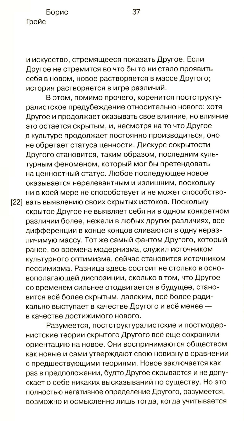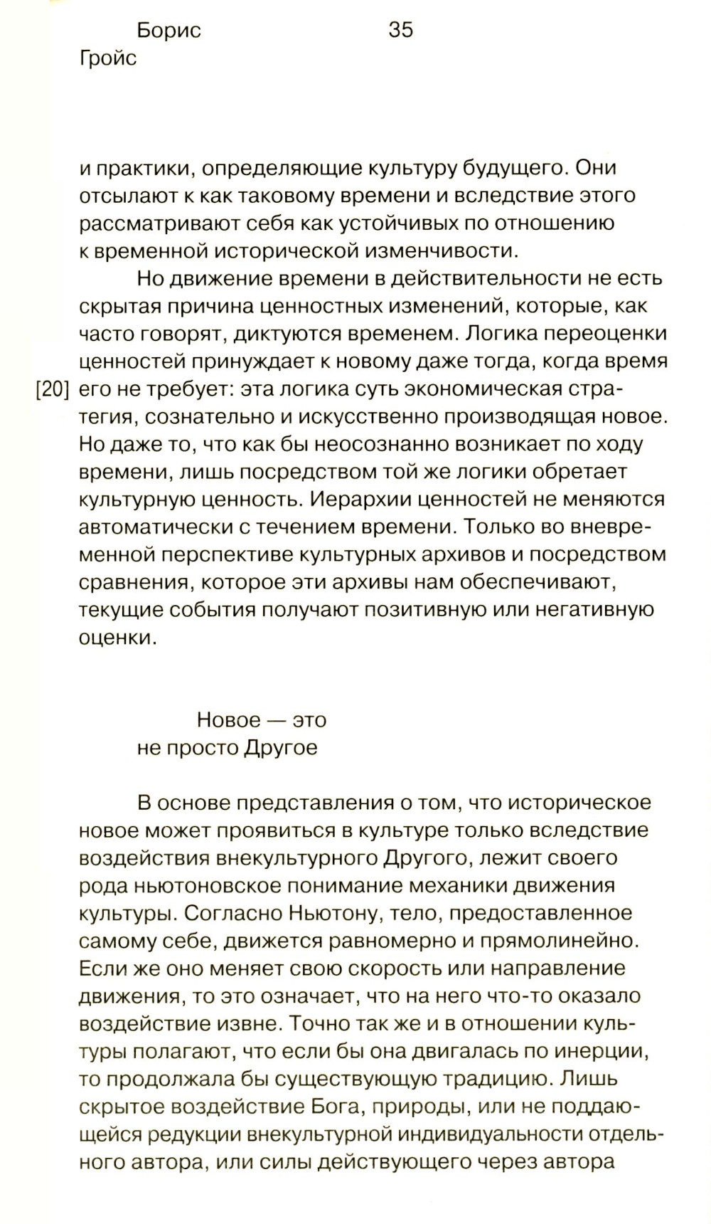 Как в эпоху постмодерна создать произведение искусства, которое будет иметь культурную ценность? На этот вопрос отвечает в своей революционной работе «О новом» искусствовед и философ Борис Гройс. На примере реди-мейда Дюшана автор исследует «культурную экономику»: обмен, происходящий между архивом культурных ценностей и профанным пространством вне этого архива. Он утверждает: инновация - это акт негативного следования традиции. Гройс исходит из предельно широкого определения экономики как обмена ценностями и полагает, что создание новых произведений искусства является диалектическим актом прерывания/удержания той или иной исторической формы производства и обмена. Негативное следование традиции переводит обыденное из плана повседневности в культурный контекст, меняя тем самым диспозицию старого и нового.| Издательство | Ад Маргинем Пресс |