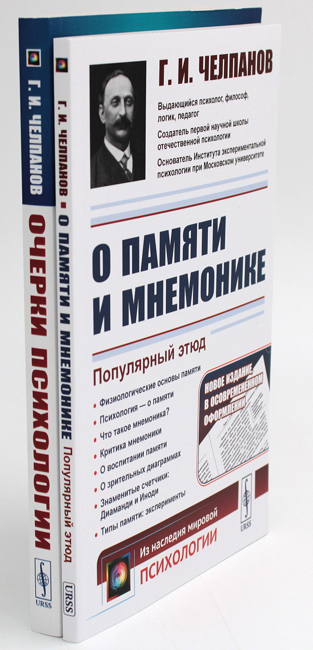 Комплект состоит из двух работ Г.И. Челпанова: «О памяти и мнемонике» и «Очерки психологии». В книге «О памяти и мнемонике» рассматриваются физиологические основы памяти, ее психологическая сторона, наиболее целесообразные методы ее развития, основные условия прочного запоминания. Отдельные главы посвящены мнемонике (мнемотехнике), системе запоминания большого объема информации, изучая которую, автор приходит к выводу, что с помощью ее приемов можно достичь выдающихся результатов в отдельных областях знаний, но невозможно развить память вообще. Книга рекомендуется психологам, философам, педагогам, студентам и аспирантам соответствующих специальностей, а также широкому кругу заинтересованных читателей. «Очерки психологии» - классическая работа по психологии, написанная выдающимся психологом и философом Г.И. Челпановым. Книга начинается с психофизиологического введения в психологию, где в числе прочего описываются различные виды психологии и дается физиологическое объяснение образования привычек при помощи метода «условных рефлексов». Далее подробно рассматриваются ощущения, воспроизведение (в том числе воспоминания и узнавание), восприятие, мышление, чувства и их основные свойства, волевой процесс (в том числе характер, темпераменты, представление о личности). Книга рекомендуется психологам, философам, историкам науки, а также широкому кругу читателей, интересующихся психологией.