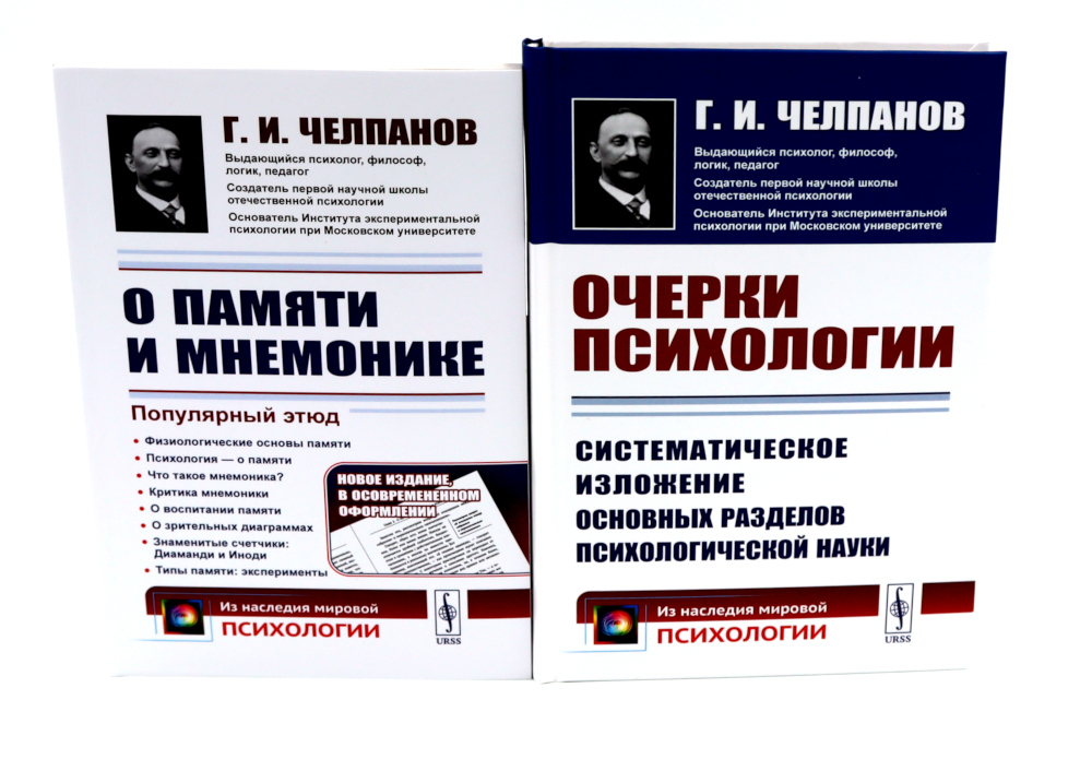 Комплект содержит книги Г.И. Челпанова: «О памяти и мнемонике» Перед читателями - книга выдающегося философа и психолога Г.И.Челпанова, в которой исследуются вопросы развития памяти. Рассматриваются физиологические основы памяти, ее психологическая сторона, наиболее целесообразные методы ее развития, основные условия прочного запоминания. Отдельные главы посвящены мнемонике (мнемотехнике), системе запоминания большого объема информации, изучая которую, автор приходит к выводу, что с помощью ее приемов можно достичь выдающихся результатов в отдельных областях знаний, но невозможно развить память вообще. Книга рекомендуется психологам, философам, педагогам, студентам и аспирантам соответствующих специальностей, а также широкому кругу заинтересованных читателей. «Очерки психологии» Вниманию читателей предлагается классическая работа по психологии, написанная выдающимся психологом и философом Г.И.Челпановым. Книга начинается с психофизиологического введения в психологию, где в числе прочего описываются различные виды психологии и дается физиологическое объяснение образования привычек при помощи метода «условных рефлексов». Далее подробно рассматриваются ощущения, воспроизведение (в том числе воспоминания и узнавание), восприятие, мышление, чувства и их основные свойства, волевой процесс (в том числе характер, темпераменты, представление о личности). Книга рекомендуется психологам, философам, историкам науки, а также широкому кругу читателей, интересующихся психологией.