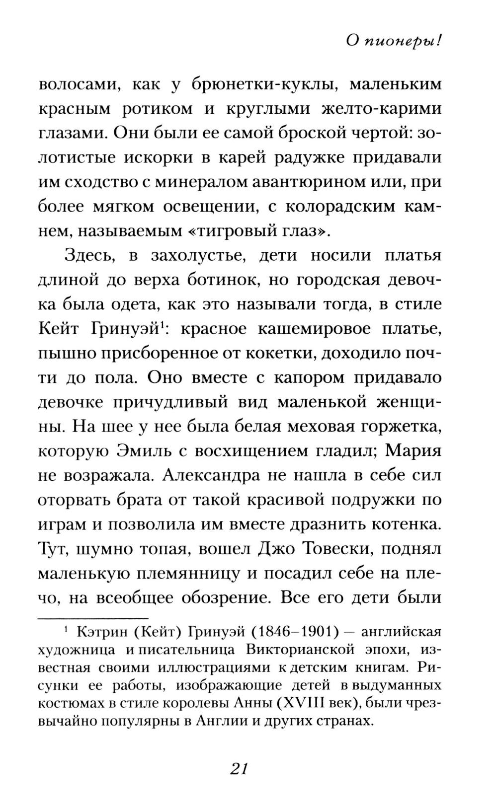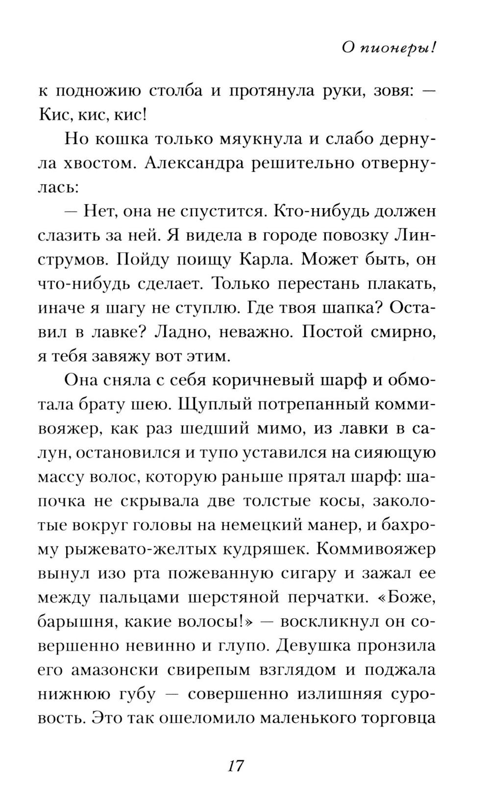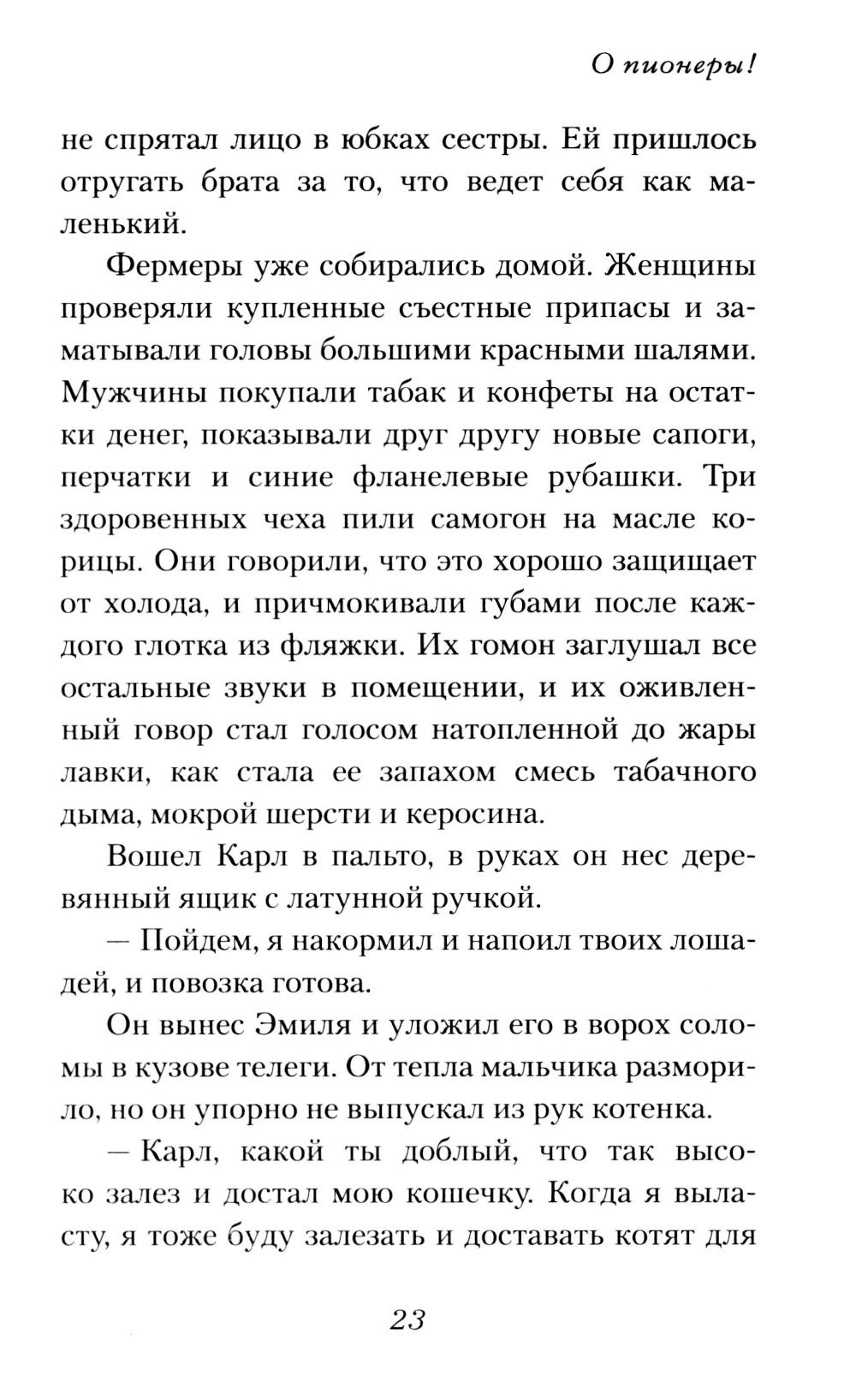 Уилла Кэсер - классик американской литературы, лауреат множества наград, среди которых Пулитцеровская премия (1923) и Prix Femina Americain (1933). После смерти отца, иммигранта из Швеции, Александра Бергсон получает в наследство ферму в штате Небраска. Впереди ее ждет множество неприятностей - нехватка денег, гибель скота, неурожайные годы, - но Александра готова на все, чтобы привести семейное дело к процветанию. В это нелегкое время, когда многие соседи сдаются и покидают ставшие родными края, она сталкивается с необходимостью сделать выбор между личным счастьем и долгом. «О пионеры!» - большой американский роман о судьбоносных переменах, поиске своего места в мире и выборе между «старым» и «новым». Книга открывает «Небраскскую трилогию» о Великих равнинах.| Издательство | Дом историй |