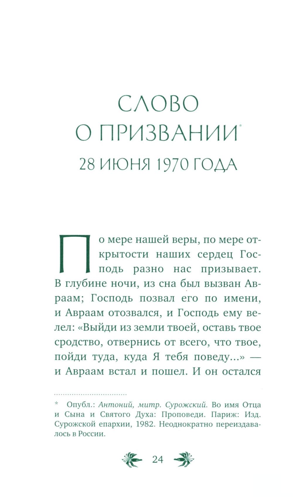В богословском наследии митрополита Сурожского Антония тема призвания - одна из центральных, чрезвычайно важных для автора. Поднимая тему призвания в своих проповедях, владыка мог говорить о православном учении о Боге и человеке и отвечать на живые вызовы современности в ситуации кризиса веры, нарастающей секуляризации Церкви и индивидуализации жизни, ситуации потери человеком веры в себя и в другого. Для владыки эта тема является провозглашением веры Божией в человека, о которой свидетельствует величие дарованного ему призвания.| Издательство | Фонд Дух. наследие митрополита Антония Сурожского |