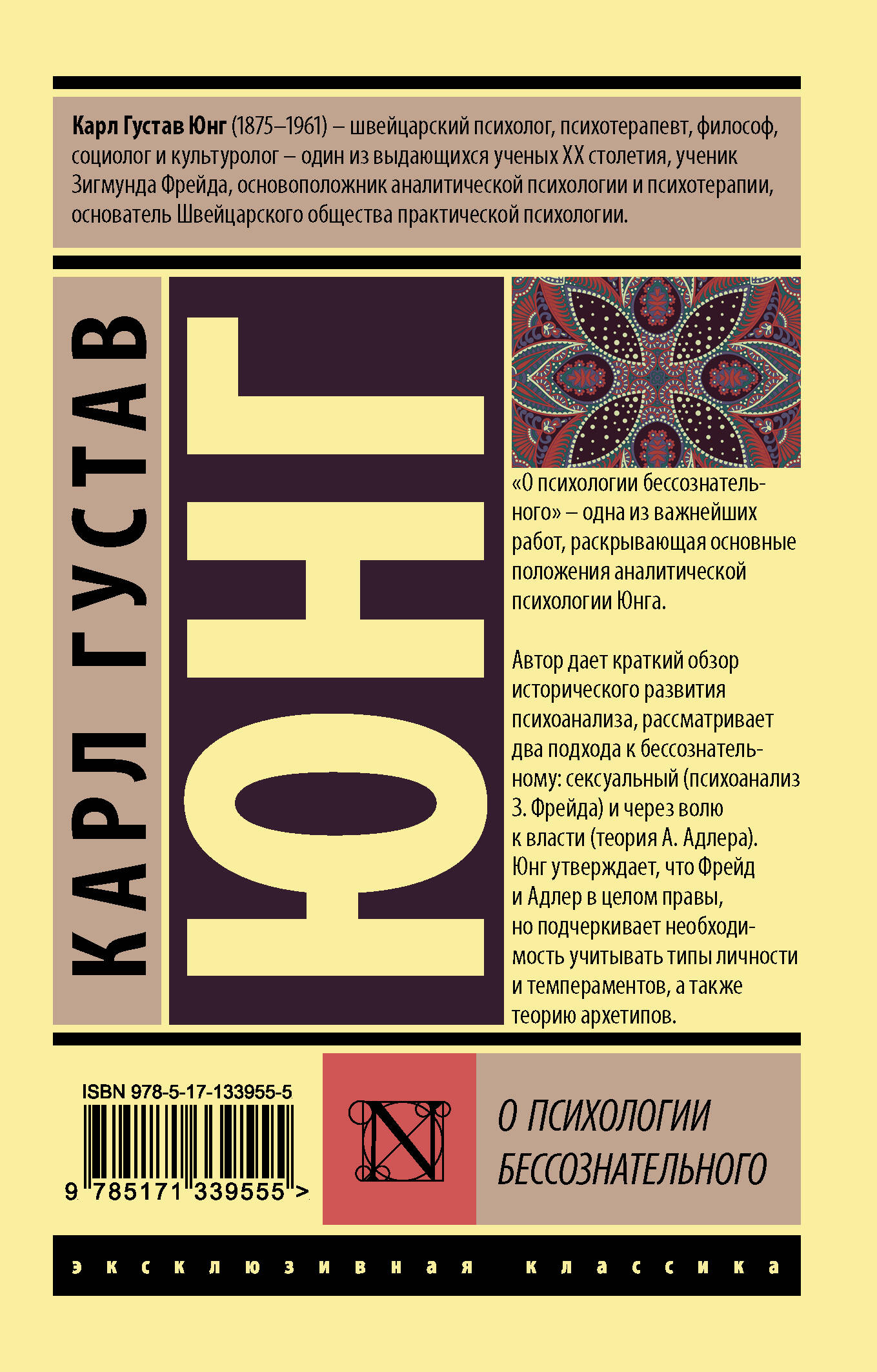 "О психологии бессознательного" - одна из важнейших работ, раскрывающая основные положения аналитической психологии Юнга. Автор дает краткий обзор исторического развития психоанализа, рассматривает два подхода к бессознательному: сексуальный (психоанализ З. Фрейда) и через волю к власти (теория А. Адлера). Юнг утверждает, что Фрейд и Адлер в целом правы, но подчеркивает необходимость учитывать типы личности и темпераментов, а также теорию архетипов.| Издательство | ИЗДАТЕЛЬСТВО "АСТ" |