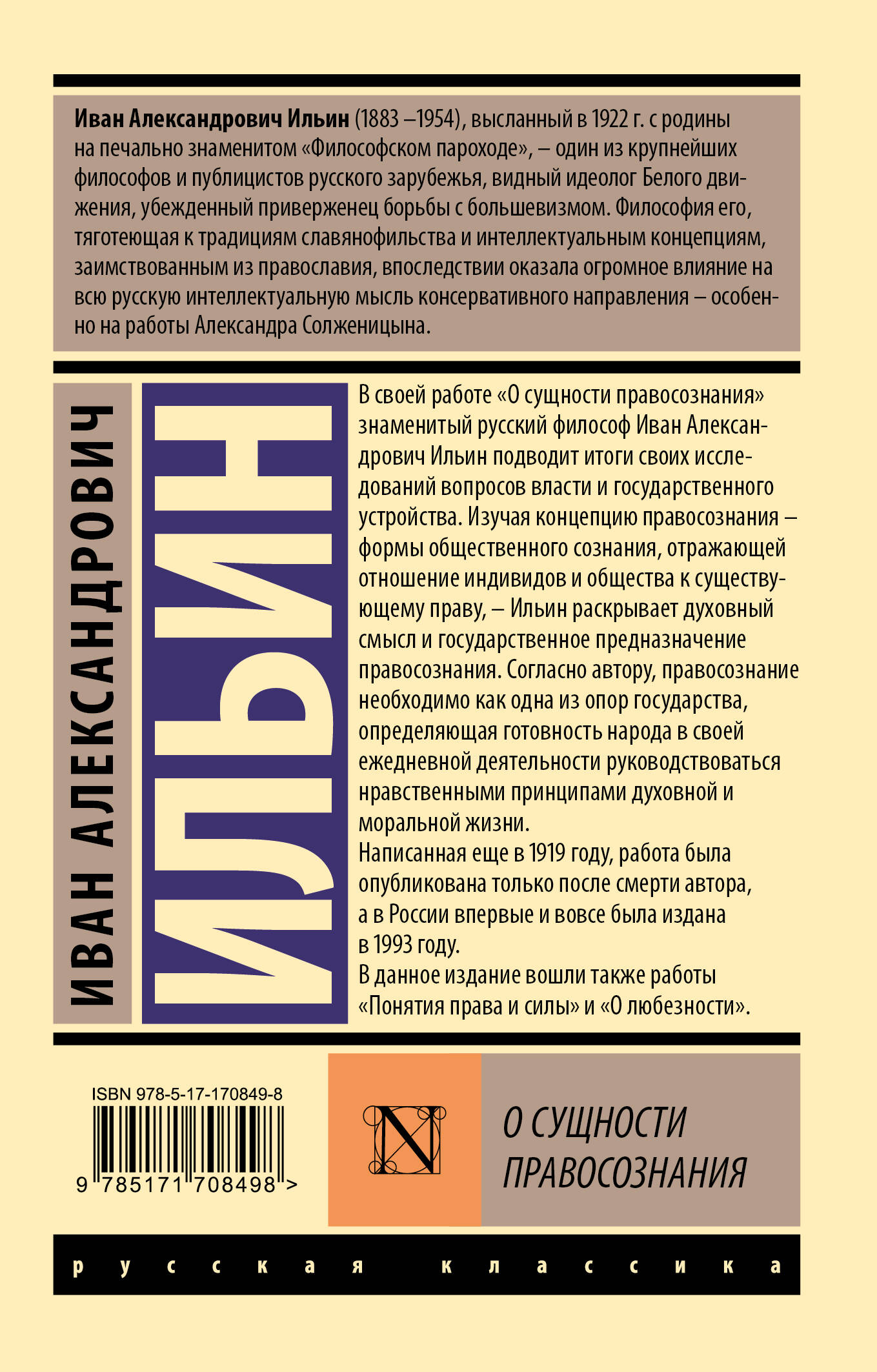 В своей работе "О сущности правосознания" знаменитый русский философ Иван Александрович Ильин подводит итоги своих исследований вопросов власти и государственного устройства. Изучая концепцию правосознания - формы общественного сознания, отражающей отношение индивидов и общества к существующему праву - Ильин раскрывает духовный смысл и государственное предназначение правосознания. Согласно автору, правосознание необходимо как одна из опор государства, определяющая готовность народа в своей ежедневной деятельности руководствоваться нравственными принципами духовной и моральной жизни. Написанная еще в 1919 году, работа была опубликована только после смерти автора, а в России впервые и вовсе была издана в 1993 году. В данное издание вошли также работы "Понятия права и силы" и "О любезности".| Издательство | Издательство "АСТ" |