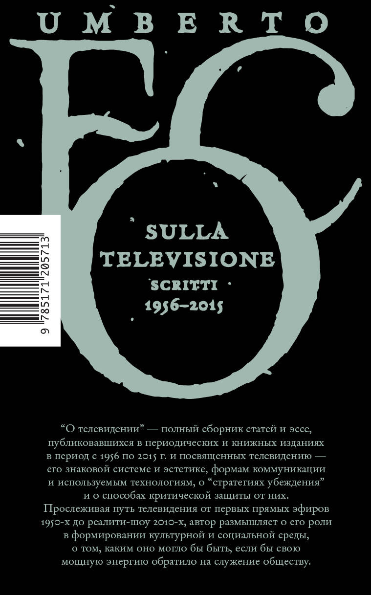 Эта антология работ Умберто Эко охватывает более половины столетия истории телевидения и посвящена его влиянию на все сферы общественной жизни: от культуры и искусства до политики, религии и образования. Автор тщательно анализирует язык и символические формы феномена телевидения, и рассматривает с разных сторон разнообразие методов, с помощью которых оно воздействует на людей. В сборник вошли статьи, эссе и доклады, опубликованные в период с 1956 года, когда в Италии появились первые эфиры, о которых Эко писал как сотрудник телекомпании RAI, вплоть до 2015 года, когда телевидение проиграло в гонке за внимание аудитории социальным сетям и интернету. От прямых эфиров до скандальных реалити-шоу, от Инспектора Деррика до "Большого брата" - в своих текстах Эко не только критикует классические телевизионные "стратегии убеждения" и популизм больших медиа, но и размышляет, как изменилась бы история телевидения, если бы оно пошло по пути служения обществу. Умберто Эко - известный итальянский ученый, медиевист, семиолог и философ культуры, заметно повлиявший на интеллектуальный ландшафт второй половины ХХ века. Его романы "Имя розы", "Баудолино", "Маятник Фуко" стали мировыми бестселлерами и были переведены более чем на 40 языков.| Издательство | Издательство "АСТ" |