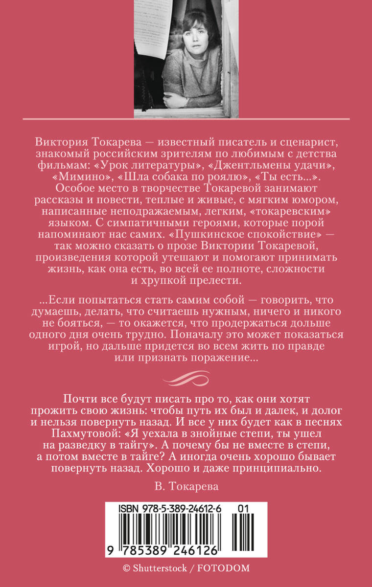Виктория Токарева - известный писатель и сценарист, знакомый российским зрителям по любимым с детства фильмам: "Урок литературы", "Джентльмены удачи", "Мимино", "Шла собака по роялю", "Ты есть...". Особое место в творчестве Токаревой занимают рассказы и повести, теплые и живые, с мягким юмором, написанные неподражаемым, легким, "токаревским" языком. С симпатичными героями, которые порой напоминают нас самих. "Пушкинское спокойствие" - так можно сказать о прозе Виктории Токаревой, произведения которой утешают и помогают принимать жизнь, как она есть, во всей ее полноте, сложности и хрупкой прелести. ...Если попытаться стать самим собой - говорить, что думаешь, делать, что считаешь нужным, ничего и никого не бояться, - то окажется, что продержаться дольше одного дня очень трудно. Поначалу это может показаться игрой, но дальше придется во всем жить по правде или признать поражение... В настоящее издание вошли рассказы 1960-1970-х годов из первых авторских сборников, а также повесть "Ехал грека".| Издательство | Азбука-Аттикус Издат.группа ООО |