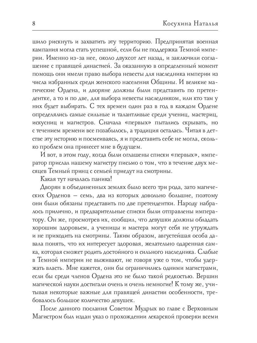 Счастье-то какое! К нам на смотрины невесты пожаловал наследный принц Темной империи! А среди длинного списка кандидаток значится и мое имя: Натаниэлла Хос, магистр черной магии. «Упрямая, злопамятная, мстительная, подозрительная, жесткая, язвительная...» Это из моей характеристики. На собеседовании мне сказали: отличные данные для того, чтобы стать будущей императрицей. Какая тут началась паника! «Не надо так расстраиваться, у вас еще есть шанс выбыть», - обрадовали меня.