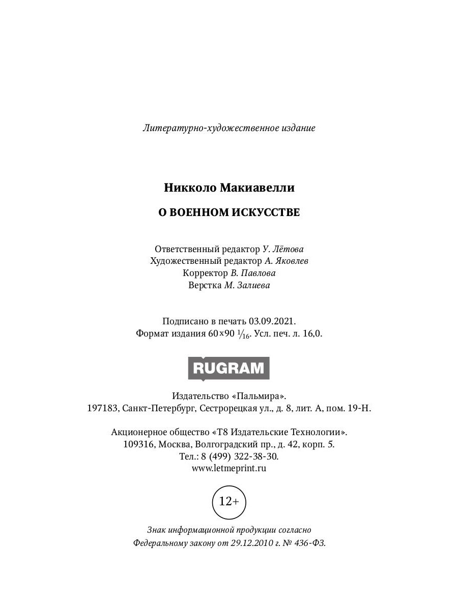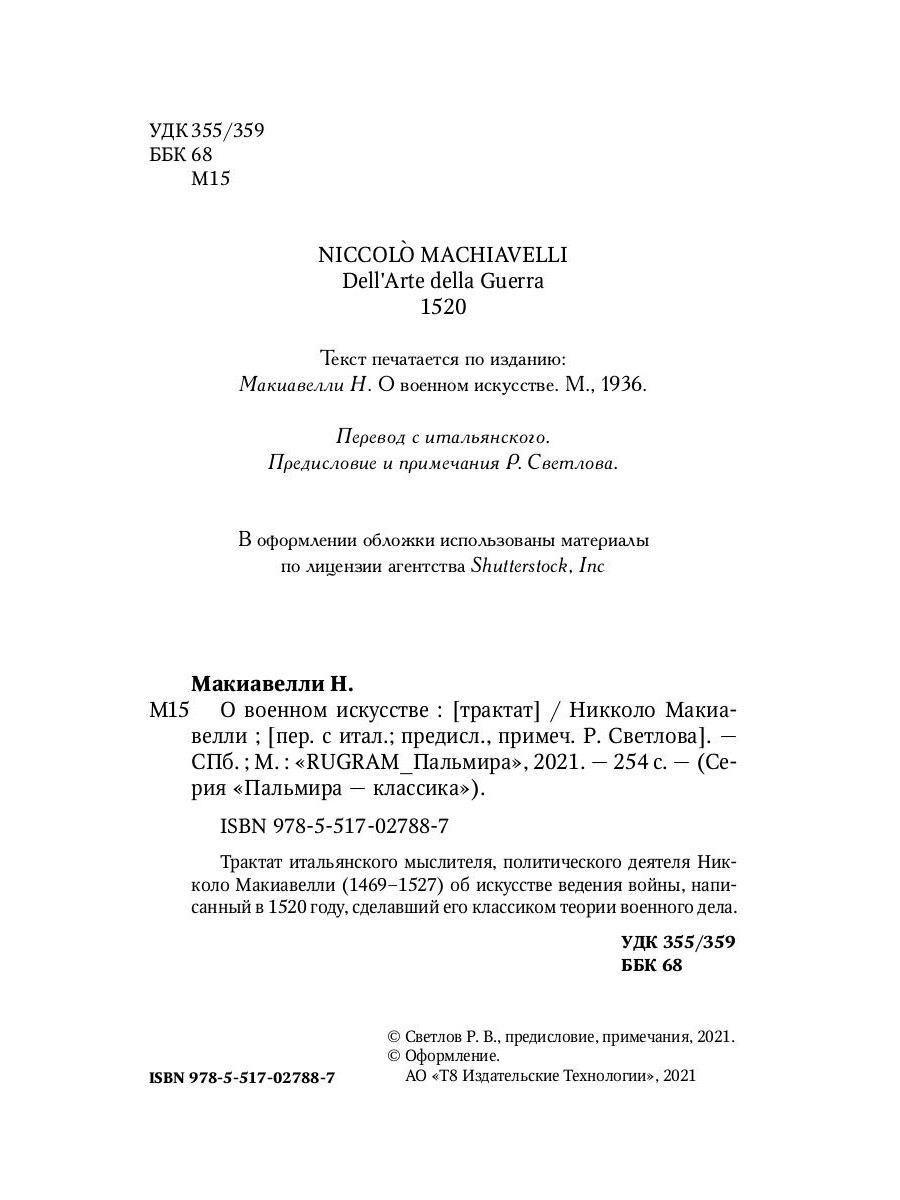 Трактат итальянского мыслителя, политического деятеля Никколо Макиавелли (1469-1527) об искусстве ведения войны, написанный в 1520 году, сделавший его классиком теории военного дела.