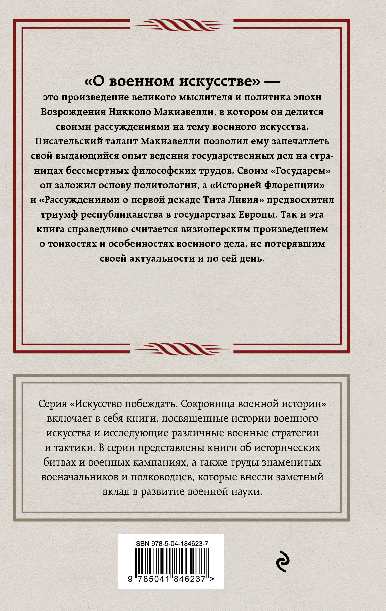Погрузитесь в мир стратегии, политики и военного искусства с классической книгой Никколо Макиавелли «О военном искусстве». Трактат, написанный в XVI веке, до сих пор остается актуальным и вдохновляет поколения лидеров и военачальников. «О военном искусстве» - это полное руководство по стратегическим техникам и тактикам, основанных на наблюдениях и анализе военных действий. Макиавелли демонстрирует свою гениальность в области военного мышления и предлагает читателю уникальную возможность увидеть ход мышления одного из величайших стратегов всех времен. Автор пишет о том, как победить в войне, как эффективно управлять армией и как преодолеть трудности, стоящие на пути к военной славе и успеху. Макиавелли делится своими наблюдениями о важности планирования, лидерстве, коммуникации и готовности к переменам на поле боя. Один из крупнейших архитекторов военной стратегии, Макиавелли предлагает новые подходы к решению вечных вопросов, глубокий анализ и практические советы. «О военном искусстве» - это не только источник военно-политической мудрости, но и исторический памятник, который продолжает вдохновлять и обучать новое поколение лидеров и мыслителей. Эта книга - неотъемлемая часть библиотеки каждого, кто стремится к познанию истины, пониманию искусства войны и достижению высот военного лидерства. Если вам интересна военная история, политическая философия, политология, эта книга станет неоценимым приобретением в вашу читательскую коллекцию. Серия «Искусство побеждать. Сокровища военной истории» включает в себя книги, посвященные истории военного искусства и исследующие различные военные стратегии и тактики. В серии представлены книги об исторических битвах и военных кампаниях, а также труды знаменитых военачальников и полководцев, которые внесли заметный вклад в развитие военной науки.| Издательство | ООО "Издательство "Эксмо" |
