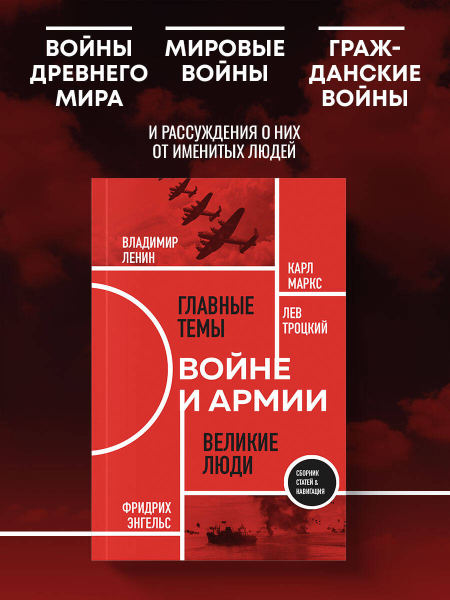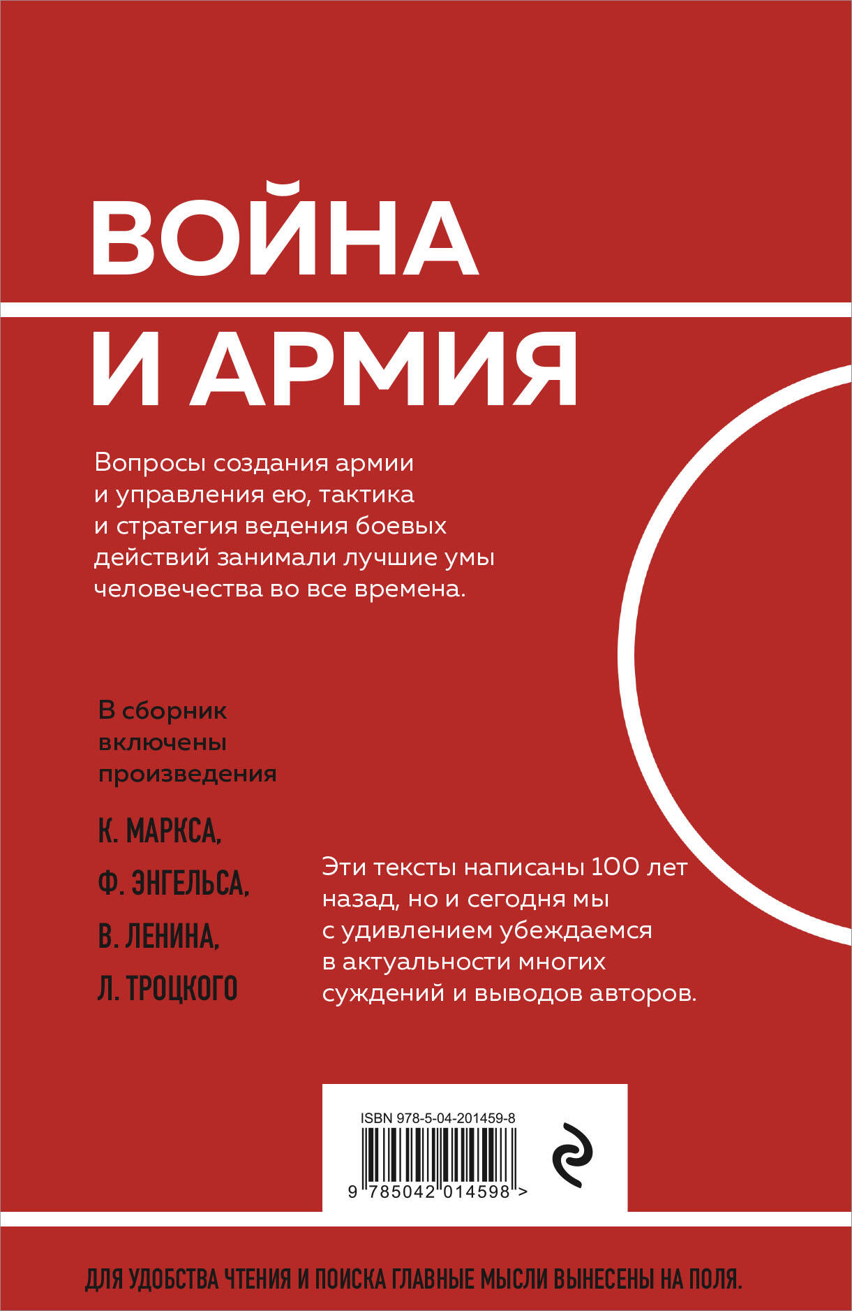 Во все времена войны были для человечества событиями грозными и трагическими, становились переломными в истории стран и государств. XIX и XX века принесли Европе и миру самые масштабные битвы и сражения, принесшие поистине революционные перемены в жизнь европейского континента, да и всего мира. Исход войн всегда определялся множеством самых разных факторов и обстоятельств и, в первую очередь, - действиями армий, полководцев, руководителей стран и государств, а еще экономикой воюющих сторон и моральным состоянием войск. Эти и многие другие вопросы составляли суть исторических, военных, экономических и политических исследований ведущих умов мира. В сборник включены основные статьи крупнейших мыслителей и исторических деятелей XIX и XX века - К. Маркса, Ф. Энгельса, В. И. Ленина и Л. Д. Троцкого, посвященные темам войны и армии. В них перед читателем предстает исторический, общественно-политический и экономический анализ как целых периодов, так и отдельных событий. Тема армии и военных действий актуальна сегодня как никогда. Предоставляем читателям возможность заново познакомиться с текстами, отодвинутыми последние полвека на дальние полки библиотек. Вы с удивлением обнаружите, как точны и актуальны многие из этих строк, написанных 100 и более лет назад. Для удобства чтения и поиска по тексту главные мысли вынесены на поля.| Издательство | ООО "Издательство "Эксмо" |