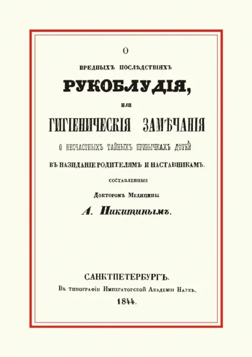 Репринт с издания. СПб. 1844 г. Сост. д-ром мед. Никитин, Александром Никитичем (1793-1858) Великолепно написанный текст, читается сейчас с упоением. В 18-ом веке эта проблема считалась очень важной для здоровья юношей. (Сегодня книга так же отличный подарок для писателей и журналистов, отличающихся чувством юмора). Книга изготовлена по технологии "печать по требованию". Тираж 30 экз.