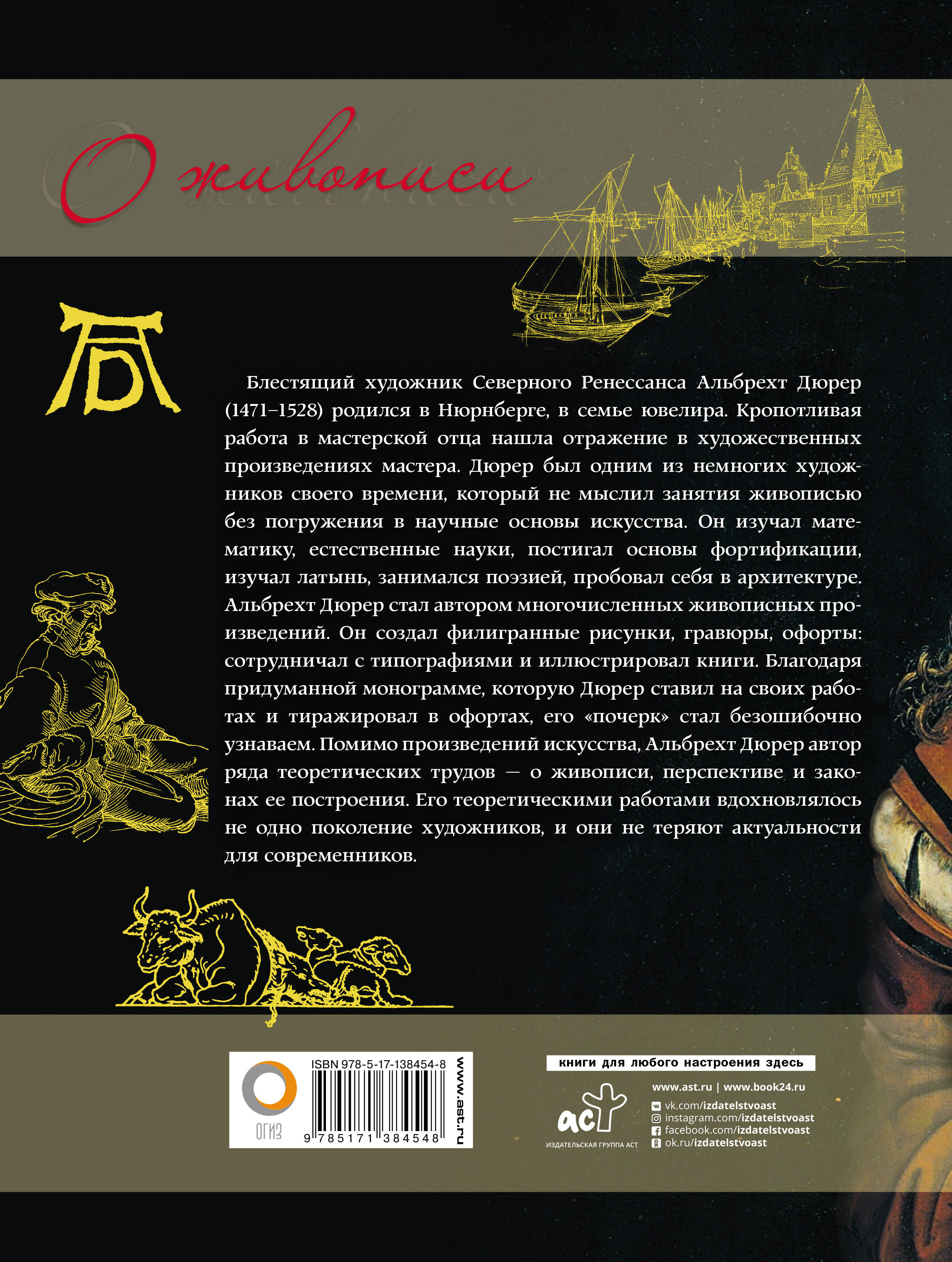 В этой книге сделана подборка наиболее интересных писем, дневниковых записей и трактатов немецкого художника. Литературное наследие живописца раскрывает перед читателем прежде всего увлеченного человека, которому небезразлично все, что его окружает. Даже живописные трактаты Дюрера лишены скучного академизма, при этом легко превратятся в "настольную книгу" современного художника или человека, готового овладеть основами живописного мастерства.| Издательство | ИЗДАТЕЛЬСТВО "АСТ" |