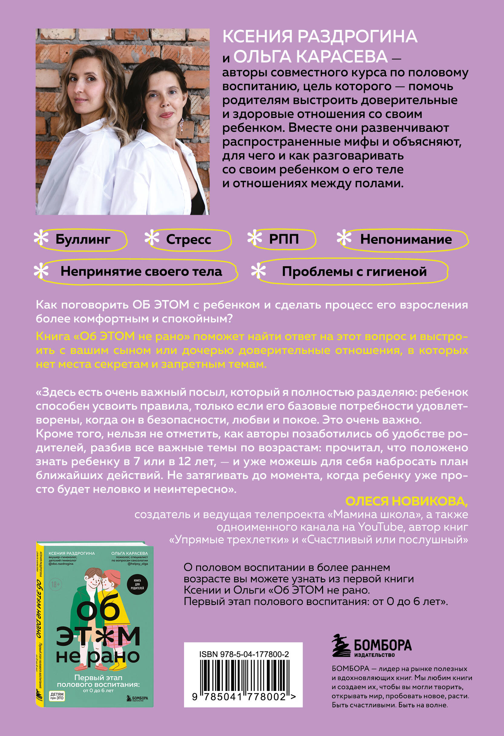 Чем старше дети, тем больше животрепещущих вопросов возникает у их родителей: • Что и как рассказать ребенку, чтобы подготовить его к периоду полового созревания и изменениям в теле? • Как говорить о сексе и объяснять базовые правила контрацепции? • Что нужно знать детям о ЗППП? • Как взрослому научиться не нарушать личные границы ребенка, а ребенку - грамотно отстаивать их? • Что делать, чтобы у ребенка сложились адекватные отношения с едой и выработались верные пищевые привычки? • Как общаться с подростком так, чтобы не поселить в нем комплексы и неуверенность? Ответы на эти и многие другие вопросы вы найдете в новой книге детского гинеколога Ксении Раздрогиной и психолога Ольги Карасевой «Об ЭТОМ не рано. Второй этап полового воспитания: от 6 до 14 лет». Авторы совместного курса о половом воспитании и книги «Об ЭТОМ не рано. Первый этап полового воспитания: от 0 до 6 лет», подскажут вам, как и зачем разговаривать с ребенком о его теле и взаимоотношениях между полами.| Издательство | ООО "Издательство "Эксмо" |