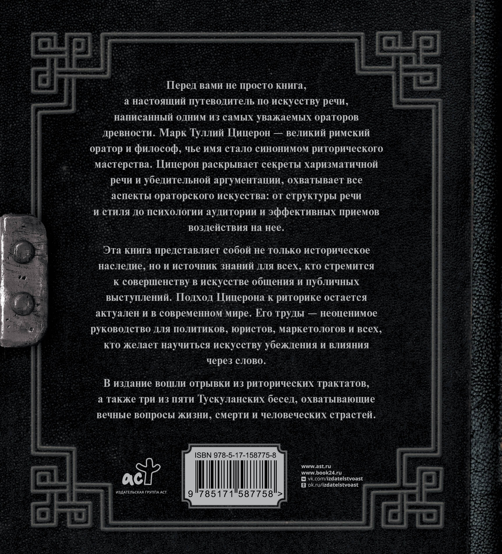 Перед вами не просто книга, а настоящий путеводитель по искусству речи, написанный одним из самых уважаемых ораторов древности. Марк Туллий Цицерон - великий римский оратор и философ, чье имя стало синонимом риторического мастерства. Цицерон раскрывает секреты харизматичной речи и убедительной аргументации, охватывает все аспекты ораторского искусства: от структуры речи и стиля до психологии аудитории и эффективных приемов воздействия на нее. Эта книга представляет собой не только историческое наследие, но и источник знаний для всех, кто стремится к совершенству в искусстве общения и публичных выступлений. Подход Цицерона к риторике остается актуален и в современном мире. Его труды - неоценимое руководство для политиков, юристов, маркетологов и всех, кто желает научиться искусству убеждения и влияния через слово. В издание вошли отрывки из риторических трактатов, а также три из пяти Тускуланских бесед, охватывающие вечные вопросы жизни, смерти и человеческих страстей.| Издательство | Издательство "АСТ" |