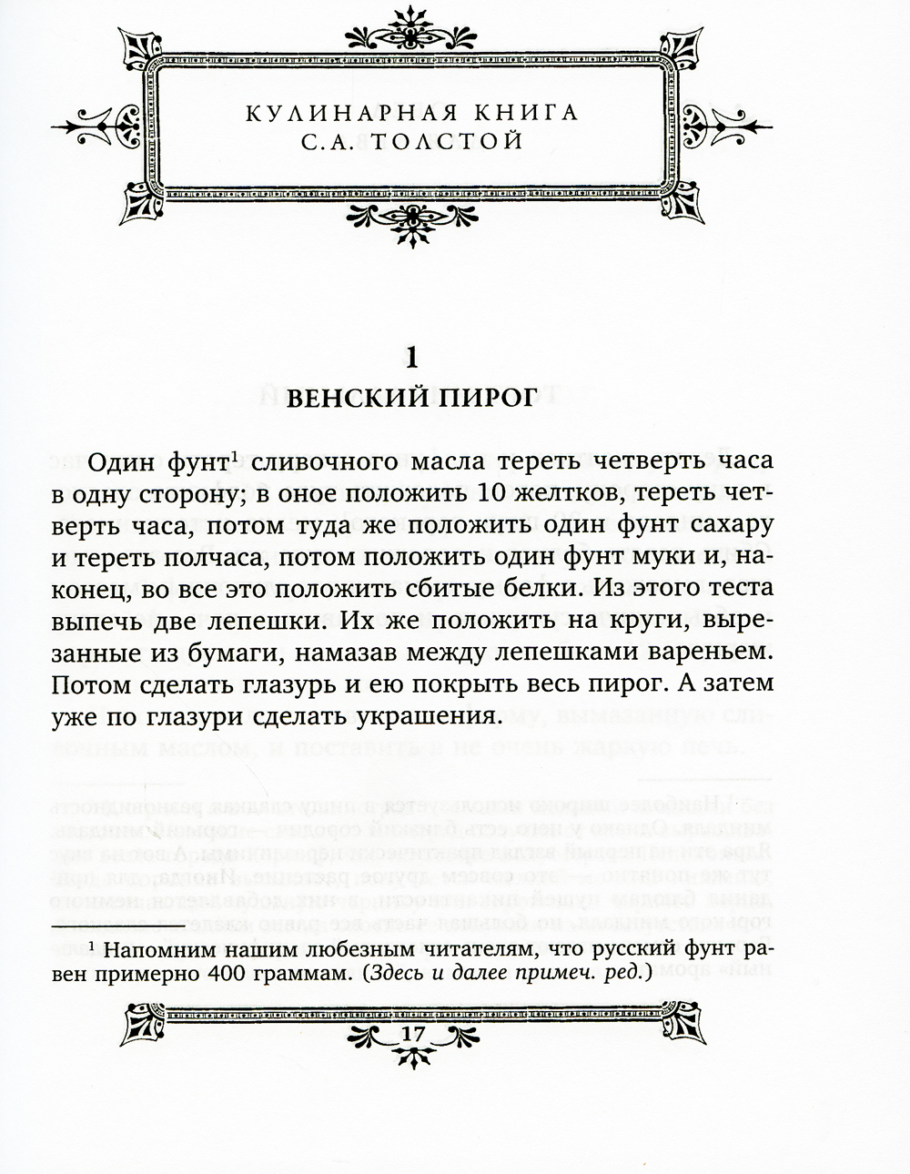 Семейные традиции в Ясной Поляне охраняла Софья Андреевна Толстая. Ее «Кулинарная книга» тому подтверждение. Названия блюд звучат так: яблочный квас Марии Николаевны - младшей сестры Л.Н. Толстого; лимонный квас Маруси Маклаковой - близкой знакомой семьи Толстых; пастила яблочная Марии Петровны Фет и, конечно, Анковский пирог - семейного доктора Берсов Николая Богдановича Анке. Толстая собрала рецепты 162 блюд, которыми питалась вся большая семья. Записывали кулинарные рецепты два человека - сама Софья Андреевна и ее младший брат Степан Андреевич Берс. У вас есть уникальная возможность узнать, что готовили в семье Толстых, и попробовать угостить этими блюдами своих родных, друзей и гостей.| Издательство | Центрполиграф |
