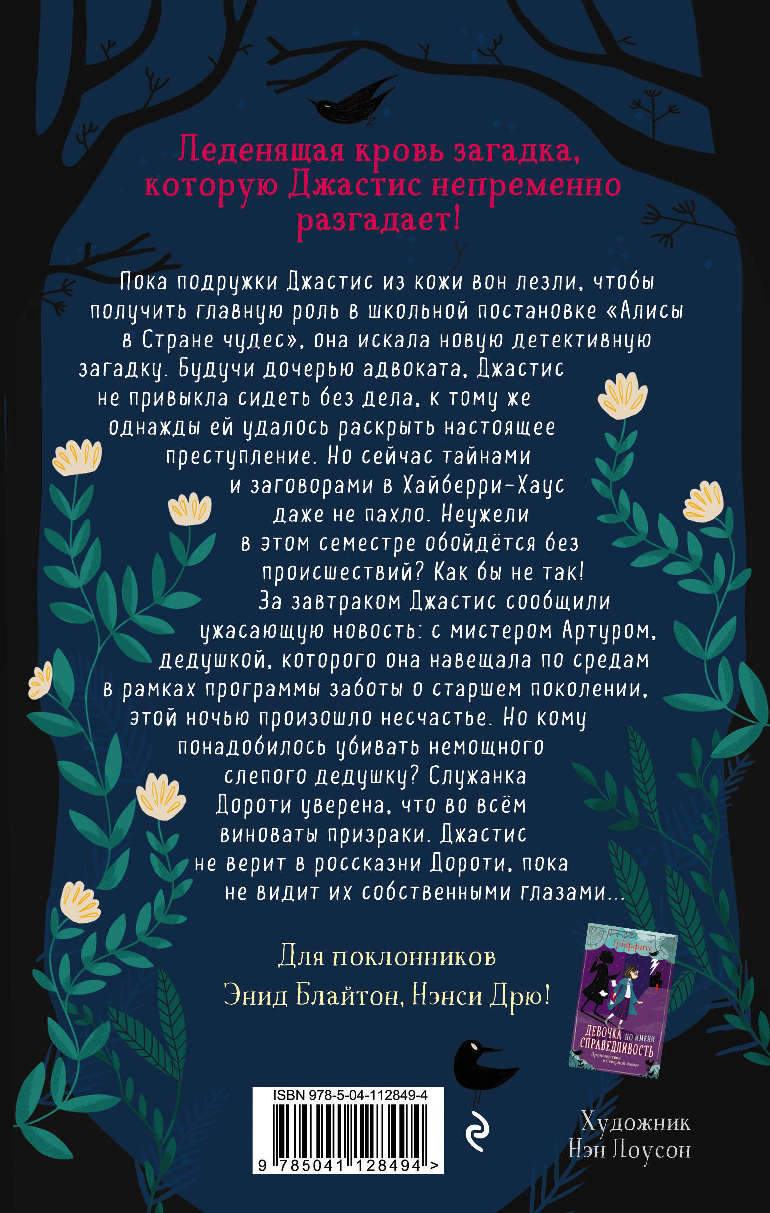 Пока подружки Джастис лезли из кожи вон, чтобы получить главную роль в школьной постановке «Алисы в Стране Чудес», она искала новую детективную загадку. Будучи дочерью адвоката, Джастис не привыкла сидеть без дела, к тому же однажды ей удалось раскрыть настоящее преступление. Но сейчас тайнами и заговорами в Хайберри-Хаус даже не пахло. Неужели в этом семестре обойдётся без происшествий? Как бы не так! За завтраком Джастис сообщили ужасающую новость: этой ночью произошло несчастье! Служанка Дороти уверена, что во всём виноваты призраки. Джастис не верит в россказни Дороти, пока не видит их собственными глазами... Таинственная атмосфера школы-пансиона, захватывающий сюжет и закрученная интрига заставят вас с неослабевающим интересом ждать развязки, которая, даже не сомневайтесь - удивит. Элли Гриффитс - талантливый автор. Эта серия - весьма успешный дебют писательницы в детской литературе. Очень остроумная, захватывающая и увлекательная книга! Не пропустите вторую книгу серии «Обед с призраком»! Для поклонников Нэнси Дрю и Энид Блайтон!| Издательство | ООО "Издательство "Эксмо" |