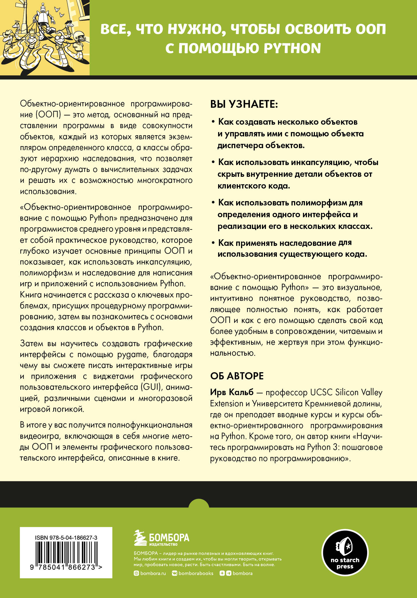Объектно-ориентированное программирование (ООП) - это метод, основанный на представлении программы в виде совокупности объектов, каждый из которых является экземпляром определенного класса, а классы образуют иерархию наследования, что позволяет по-другому думать о вычислительных задачах и решать их с возможностью многократного использования. «Объектно-ориентированное программирование с помощью Python» предназначено для программистов среднего уровня и представляет собой практическое руководство, которое глубоко изучает основные принципы ООП и показывает, как использовать инкапсуляцию, полиморфизм и наследование для написания игр и приложений с использованием Python. Книга начинается с рассказа о ключевых проблемах, присущих процедурному программированию, затем вы познакомитесь с основами создания классов и объектов в Python. Затем вы научитесь создавать графические интерфейсы c помощью pygame, благодаря чему вы сможете писать интерактивные игры и приложения с виджетами графического пользовательского интерфейса (GUI), анимацией, различными сценами и многоразовой игровой логикой. В итоге у вас получится полнофункциональная видеоигра, включающая в себя многие методы ООП и элементы графического пользовательского интерфейса, описанные в книге. Вы узнаете, как: • Создавать несколько объектов и управлять ими с помощью объекта диспетчера объектов. • Научитесь использовать инкапсуляцию, чтобы скрыть внутренние детали объектов от клиентского кода. • Научитесь использовать полиморфизм для определения одного интерфейса и реализации его в нескольких классах. • Сможете применять наследование для использования существующего кода. «Объектно-ориентированное программирование с помощью Python» - это визуальное, интуитивно понятное руководство, позволяющее полностью понять, как работает ООП и как с его помощью сделать свой код более удобным в сопровождении, читаемым и эффективным, не жертвуя при этом функциональностью. ОБ АВТОРЕ Ирв Калб - адъюнкт-профессор UCSC Silicon Valley Extension и Университета Силиконовой долины, где он преподает вводные курсы и курсы объектно-ориентированного программирования на Python. Он также автор книги «Научитесь программировать на Python 3: пошаговое руководство по программированию».