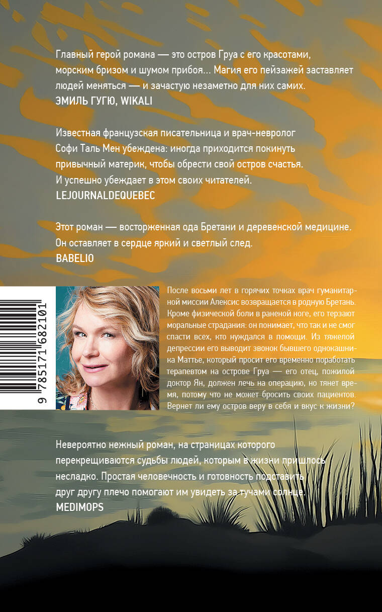 - Идеальное летнее чтение - невероятно атмосферный роман с увлекательным сюжетом, наполненный солнцем и морским ветром. - «Обещание острова» - книга Софи Таль Мен, одной из самых известных французских романисток, которую ставят в один ряд с такими звездами женской прозы, как Аньес Мартен-Люган, Аньес Ледиг, Рафаэлла Джордано и Виржини Гримальди. - Значительное место в романе занимает остров Груа во французском регионе Бретань. Софи Таль Мен сама родом из этих мест, поэтому с невероятной любовью знакомит читателей с красотой дикой природы, суровыми, но добрыми и честными бретонцами, с их культурой и кухней. В конце книги писательница даже делится фирменными рецептами острова Груа. - Главный герой романа - тридцатилетний врач Алексис, который многие годы работал в горячих точках и был ранен в ногу. Бывший однокашник предлагает ему занять должность терапевта на острове Груа: нужно подменить пожилого доктора, нуждающегося в срочной операции. Софи Таль Мен не понаслышке знает о проблемах своих героев: она сама много лет практикующий врач-невролог, а все ее романы так или иначе связаны с медициной. - Удивительная природа, милые и порой чудаковатые жители острова и занятия любимой профессией помогают Алексису вновь обрести вкус к жизни и веру в свое дело. К тому же он знакомится с прекрасной Оливией, которая, правда, не торопится впускать его в свою жизнь… - «Обещание острова» - захватывающий и трогательный роман о любви и дружбе, самопожертвовании и поиске своего места в мире, о преданности своему делу и надежде, который заставит читателей смеяться и плакать вместе с его незабываемыми персонажами.