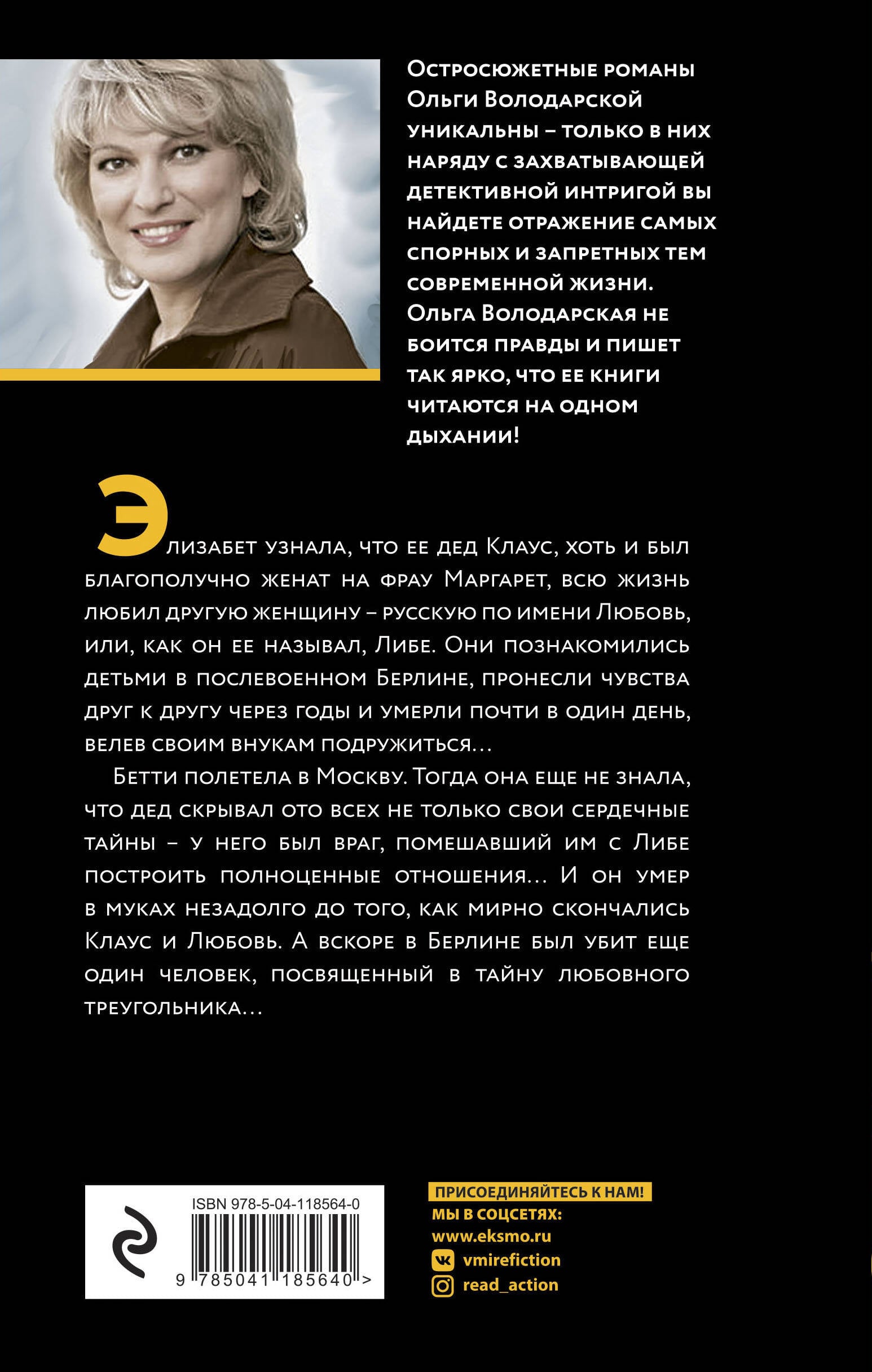 Элизабет узнала, что ее дед Клаус, хоть и был благополучно женат на фрау Маргарет, всю жизнь любил другую женщину - русскую по имени Любовь, или, как он ее называл, Либе. Они познакомились детьми в послевоенном Берлине, пронесли чувства друг к другу через годы и умерли почти в один день, велев своим внукам подружиться... Бетти полетела в Москву. Тогда она еще не знала, что дед скрывал ото всех не только свои сердечные тайны - у него был враг, помешавший им с Либе построить полноценные отношения... И он умер в муках незадолго до того, как мирно скончались Клаус и Любовь. А вскоре в Берлине был убит еще один человек, посвященный в тайну любовного треугольника... Ольга Володарская - автор более чем сорока книг в жанре остросюжетного романа. Ее детективы сочетают остроту современной прозы и напряженность психологического триллера. В них вы найдете все, что хотели, но боялись узнать. Поэтому серия книг, в которой выходят книги Ольги Володарской, так и называется - «Никаких запретных тем»!| Издательство | ООО "Издательство "Эксмо" |