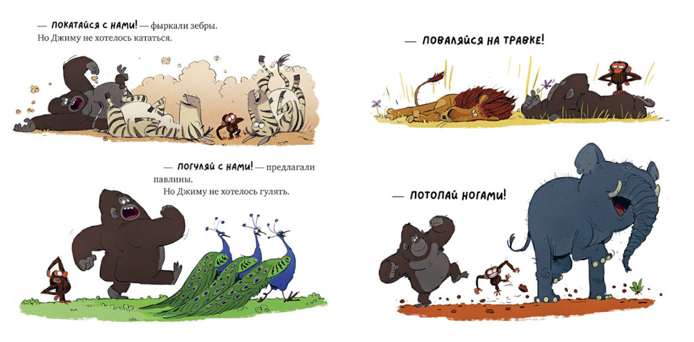 Джим сегодня проснулся в дурном настроении. Всё было не так: солнце светило слишком ярко, небо было слишком синим, даже бананы казались ЧЕРЕСЧУР сладкими! Его друзья удивляются, как можно ворчать в ТАКОЙ чудесный день?! Наперебой они дают ему советы, как почувствовать себя счастливым. Джим не выдерживает... Может, просто ему нужен один день, чтобы немного погрустить?