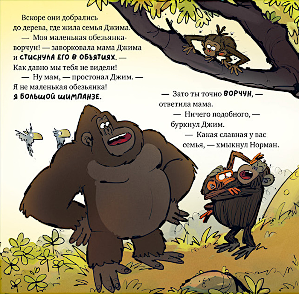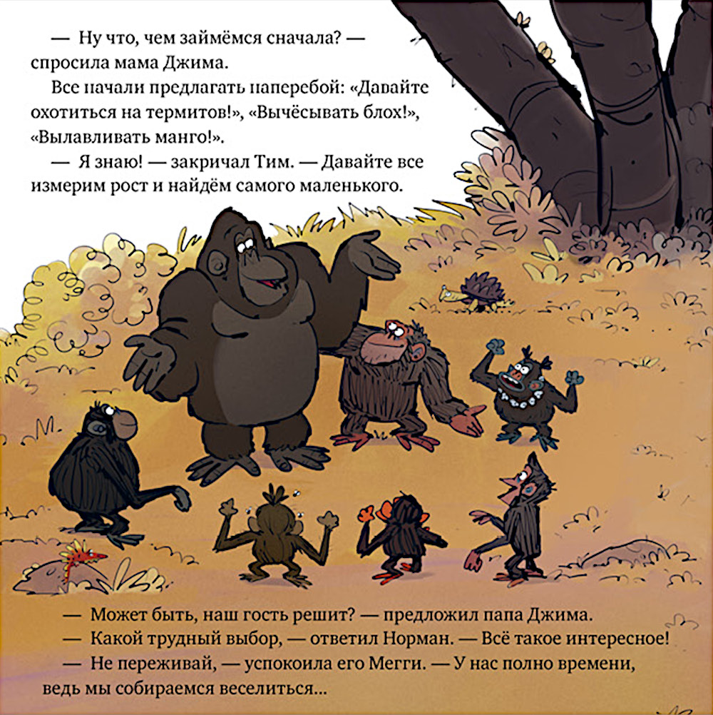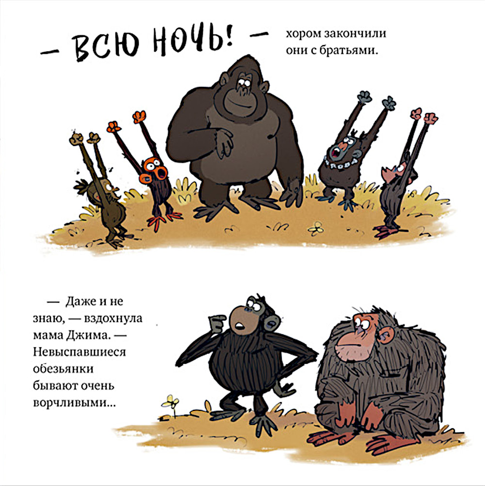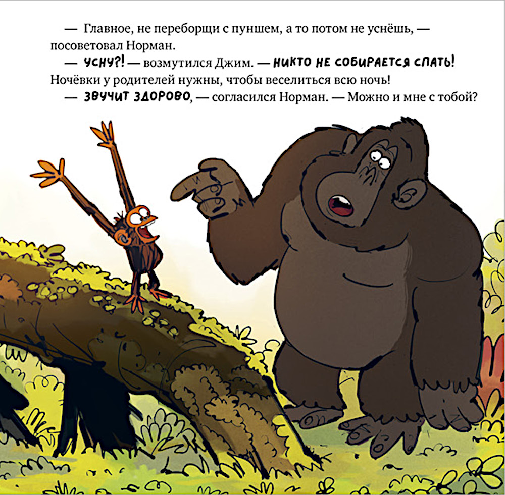Обезьянка Джим идёт к родителям в гости с ночевкой. Но он вовсе не собирается спать: зачем отдыхать, если можно веселиться всю ночь? Вместе с другом-гориллой Норманом и своей большой семьёй Джим устраивает полночный пир и вечеринку до утра.| Издательство | Клевер-Медиа-Групп |