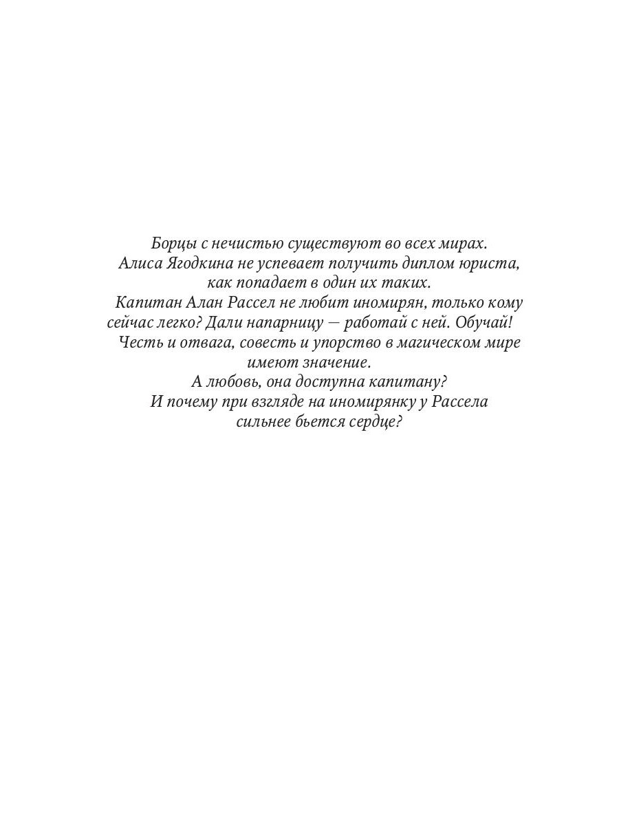 Борцы с нечистью существуют во всех мирах. Не успевает Алиса Ягодкина получить диплом юриста, как попадает в один из таких. Капитан Алан Рассел не любит иномирян, только кому сейчас легко? Дали напарницу - работай с ней. Обучай! Честь и отвага, совесть и упорство в магическом мире имеют значение. А любовь, она доступна капитану? И почему при взгляде на иномирянку у Рассела сильнее бьется сердце?| Издательство | Т8 RUGRAM |