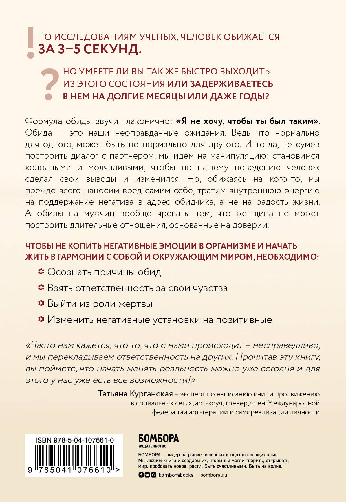 По исследованиям ученых, человек обижается за 3-5 секунд. Но умеете ли вы так же быстро выходить из этого состояния или задерживаетесь в нем на долгие месяц или даже годы? Формула обиды звучит лаконично: «Я не хочу, чтобы ты был таким». Обида - это наши неоправданные ожидания. Ведь что нормально для одного, может быть не нормально для другого. И тогда, не сумев построить диалог с партнером, мы идем на манипуляцию: становимся холодными и молчаливыми, чтобы по нашему поведению человек сделал свои выводы и изменился. Но обижаясь на кого-то, мы прежде всего наносим вред самому себе, тратим жизненную энергию на поддержание негатива в адрес обидчика, а не на радость жизни. А женские обиды на мужчин вообще чреваты тем, что она не может построить длительные отношения, построенные на доверии. Чтобы не копить негативные эмоции в организме и начать жить в гармонии с собой и окружающим миром, необходимо: * Осознать причины обид. * Взять ответственность за свои чувства. * Выйти из позиции жертвы. * Изменить негативные установки на позитивные.| Издательство | ООО "Издательство "Эксмо" |