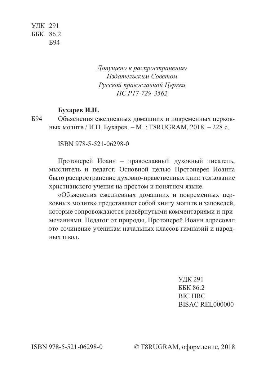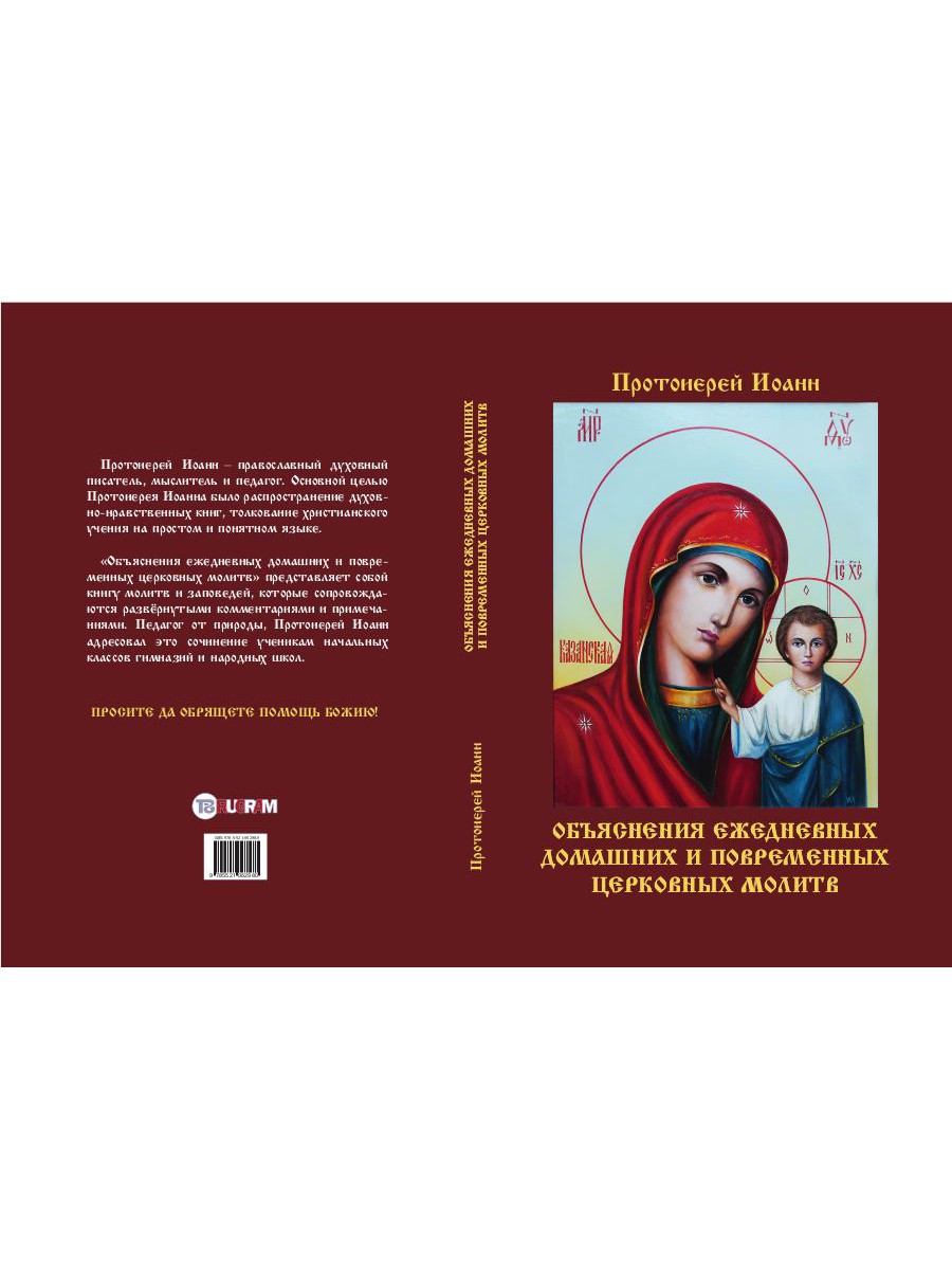 Протоиерей Иоанн - православный духовный писатель, мыслитель и педагог. Основной целью Протоиерея Иоанна было распространение духовно-нравственных книг, толкование христианского учения на простом и понятном языке. «Объяснения ежедневных домашних и повременных церковных молитв» представляет собой книгу молитв и заповедей, которые сопровождаются развёрнутыми комментариями и примечаниями. Педагог от природы, Протоиерей Иоанн адресовал это сочинение ученикам начальных классов гимназий и народных школ.| Издательство | Т8 RUGRAM |