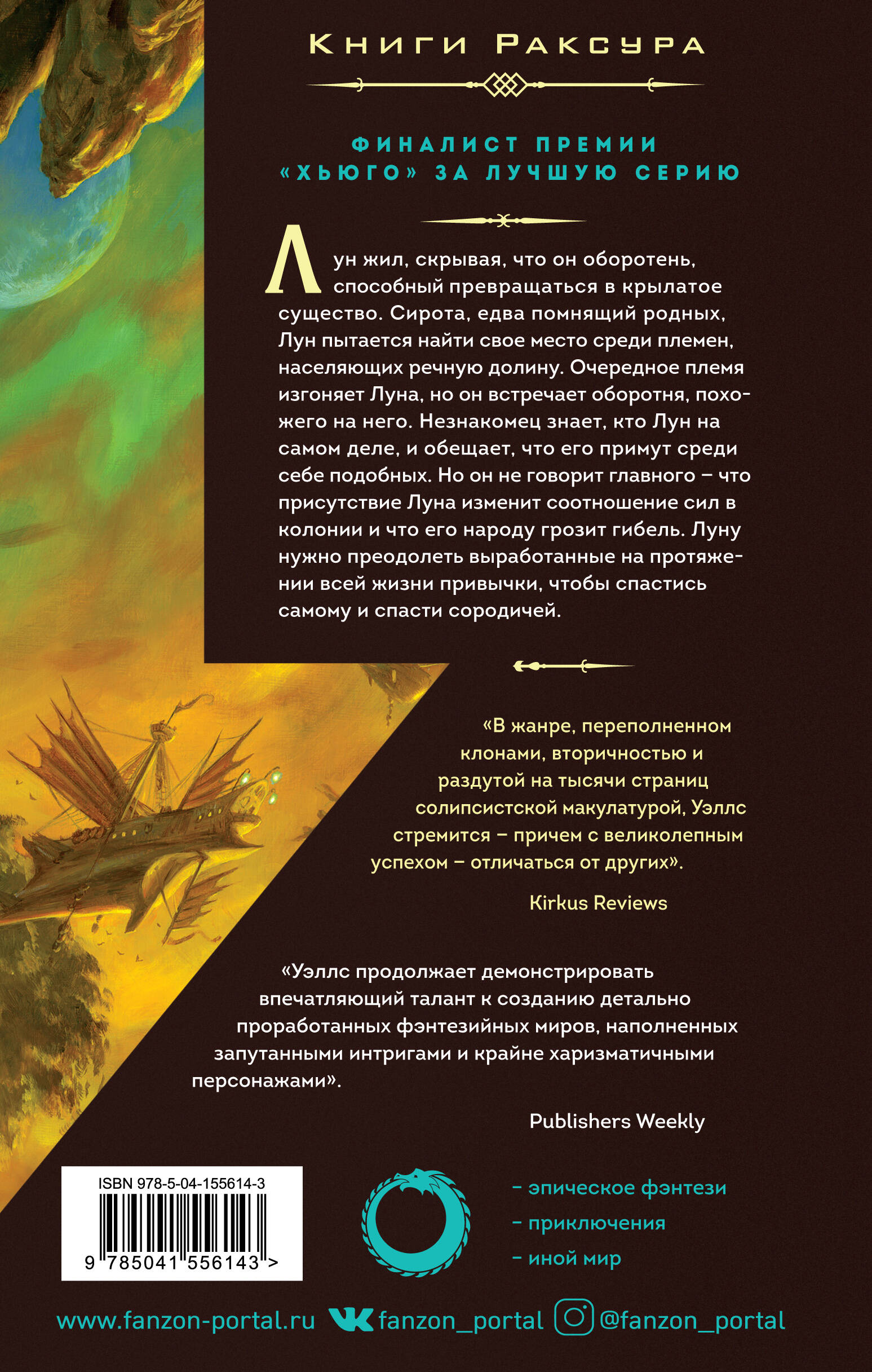 Лун жил, скрывая, что он оборотень, способный превращаться в крылатое существо. Сирота, едва помнящий родных, Лун пытается найти свое место среди племен, населяющих речную долину. Очередное племя изгоняет Луна, но он встречает оборотня, похожего на него. Незнакомец знает, кто Лун на самом деле, и обещает, что его примут среди себе подобных. Но он не говорит главного - что присутствие Луна изменит соотношение сил в колонии и что его народу грозит гибель. Луну нужно преодолеть выработанные на протяжении всей жизни привычки, чтобы спастись самому и спасти сородичей. «Одна из лучших новых писательниц этого жанра». - К. Д. Черри «Уэллс - ярчайшая новая звезда на небосклоне фэнтези за последние годы». - Portland Oregonian «Произведения Уэллс всегда заставляют нас желать продолжения». - Cleveland Plain Dealer «В жанре, переполненном клонами, вторичностью и раздутой на тысячи страниц солипсистской макулатурой, Уэллс стремится - причем с великолепным успехом - отличаться от других». - Kirkus Reviews «Уэллс продолжает демонстрировать впечатляющий талант к созданию детально проработанных фэнтезийных миров, наполненных запутанными интригами и крайне харизматичными персонажами». - Publishers Weekly «Уэллс никогда не перестает заинтриговывать, забавлять и восхищать читателя... Я очень рекомендую любое из произведений Марты Уэллс - и желаю, чтобы она писала их быстрее!» - Дженнифер Роберсон| Издательство | Эксмо |