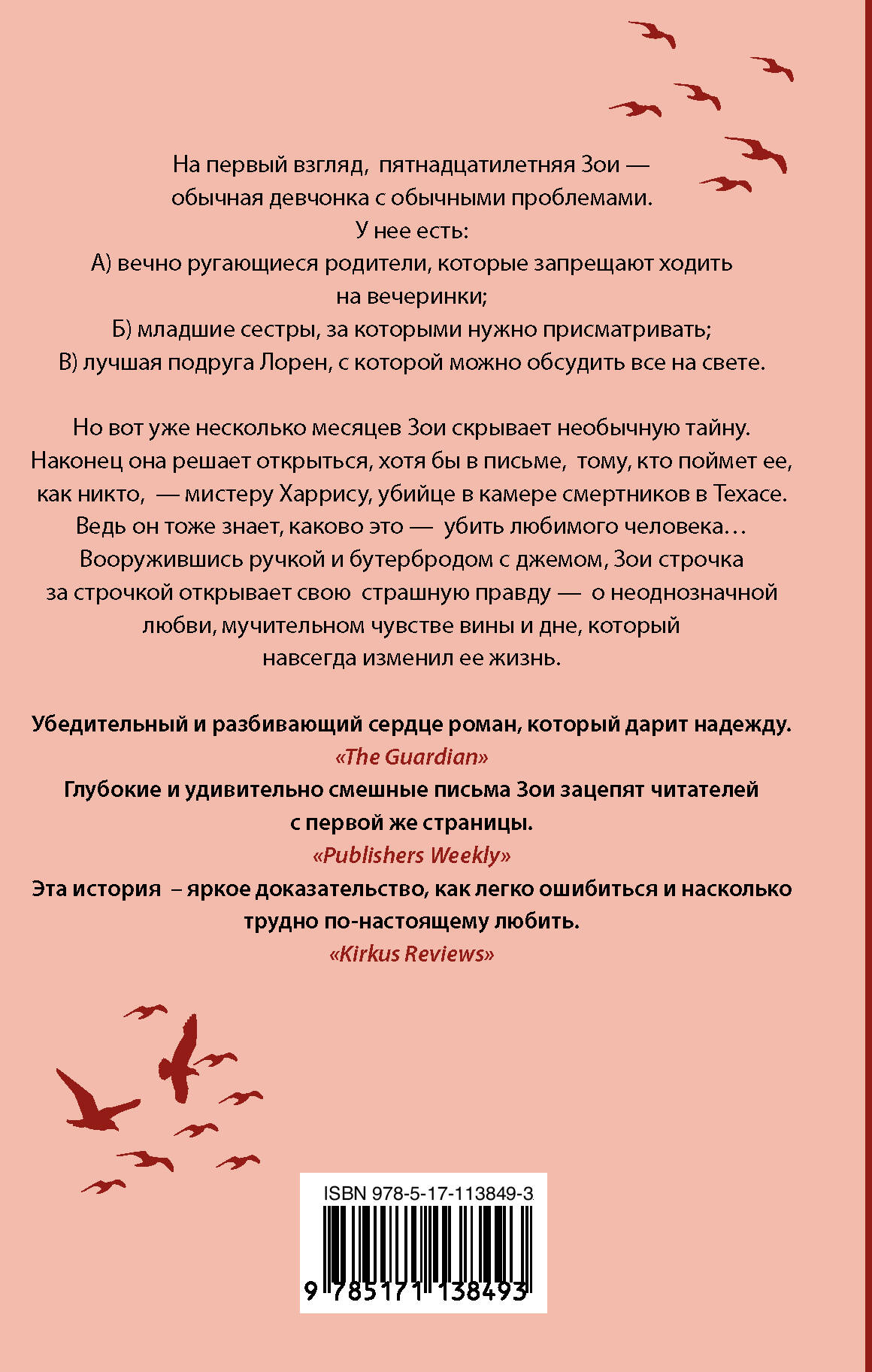 На первый взгляд, пятнадцатилетняя Зои - обычная девчонка с обычными проблемами. У нее есть: А) вечно ругающиеся родители, которые запрещают ходить на вечеринки; Б) младшие сестры, за которыми нужно присматривать; В) лучшая подруга Лорен, с которой можно обсудить все на свете. Но вот уже несколько месяцев Зои скрывает необычную тайну. Наконец она решает открыться, хотя бы в письме, тому, кто поймет ее как никто, - мистеру Харрису, убийце в камере смертников в Техасе. Ведь он тоже знает, каково это - убить любимого человека… Вооружившись ручкой и бутербродом с джемом, Зои строчка за строчкой открывает свою страшную правду - о неоднозначной любви, мучительном чувстве вины и дне, который навсегда изменил ее жизнь.| Издательство | ИЗДАТЕЛЬСТВО "АСТ" |
