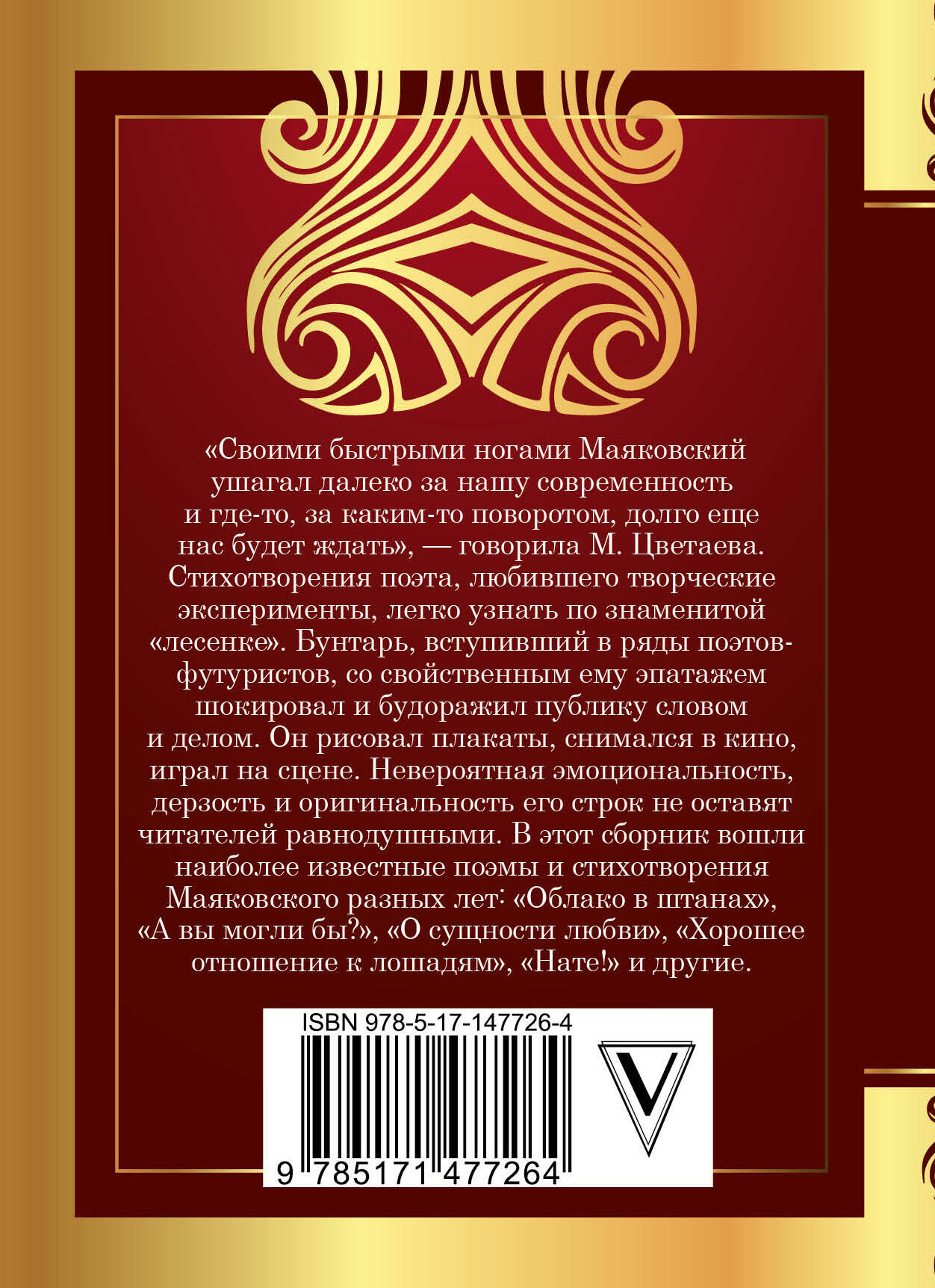"Своими быстрыми ногами Маяковский ушагал далеко за нашу современность и где-то, за каким-то поворотом, долго еще нас будет ждать", - говорила М. Цветаева. Стихотворения поэта, любившего творческие эксперименты, легко узнать по знаменитой "лесенке". Бунтарь, вступивший в ряды поэтов-футуристов, со свойственным ему эпатажем, шокировал и будоражил публику словом и делом. Он рисовал плакаты, снимался в кино, играл на сцене. Невероятная эмоциональность, дерзость и оригинальность его строк не оставят читателей равнодушными. В этот сборник вошли наиболее известные поэмы и стихотворения Маяковского разных лет: "Облако в штанах", "Во весь голос", "А вы могли бы?", "О сущности любви", "Хорошее отношение к лошадям", "Нате!" и другие.| Издательство | ИЗДАТЕЛЬСТВО "АСТ" |