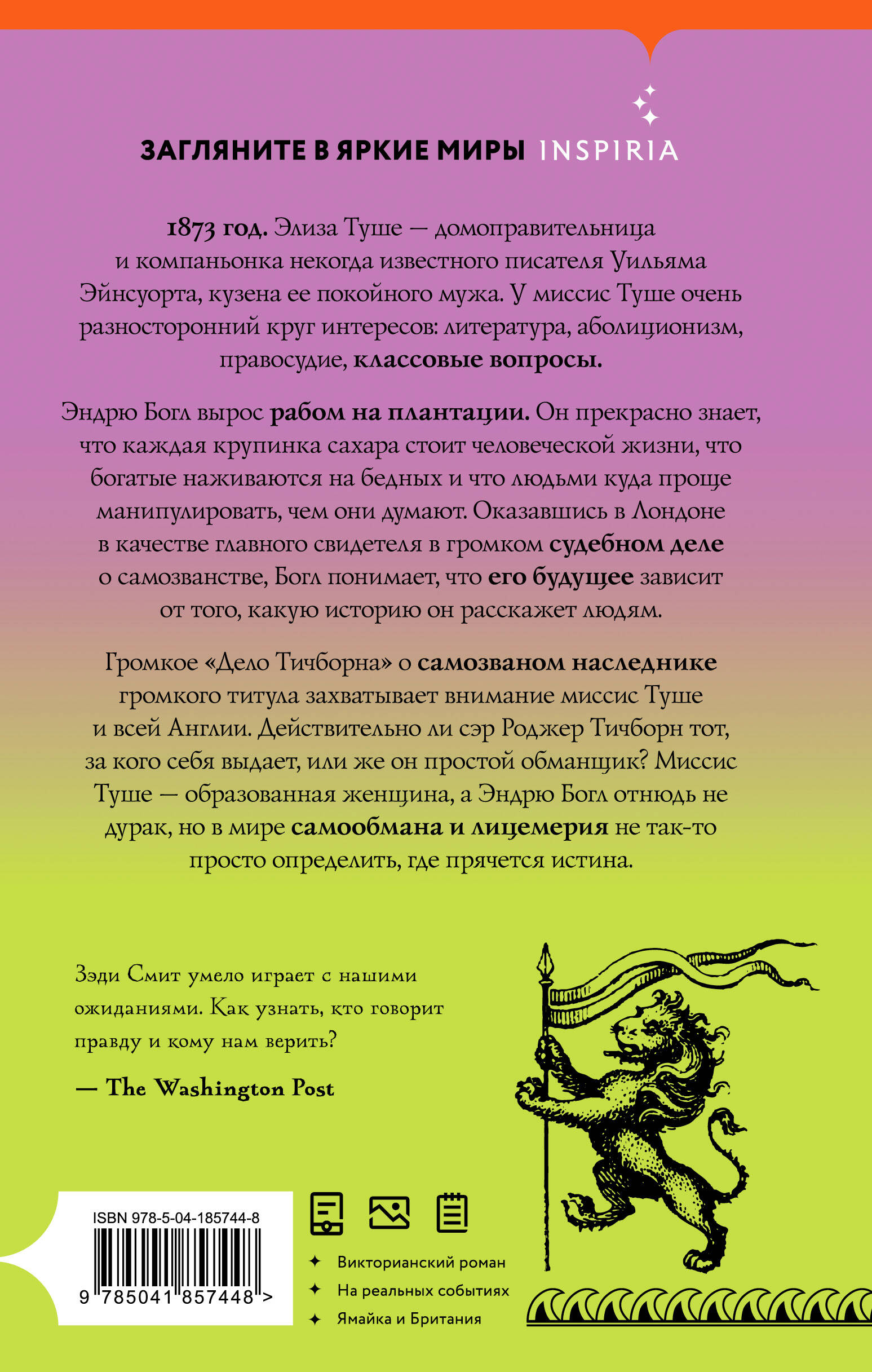 1873 год. Элиза Туше - домоправительница и компаньонка некогда известного писателя Уильяма Эйнсуорта, кузена ее покойного мужа. У миссис Туше очень разносторонний круг интересов: литература, аболиционизм, правосудие, классовые вопросы. Миссис Туше подозревает, что ее кузен на самом деле начисто лишен литературного таланта, что его друг Чарльз Диккенс на самом деле тиран и моралист, а вся Англия не более чем «страна фасадов», где все не то, чем кажется. Эндрю Богл вырос рабом на плантации. Он прекрасно знает, что каждая крупинка сахара стоит человеческой жизни, что богатые наживаются на бедных и что людьми куда проще манипулировать, чем они думают. Оказавшись в Лондоне в качестве главного свидетеля в громком судебном деле о самозванстве, Богл понимает, что его будущее зависит от того, какую историю он расскажет людям. «Дело Тичборна», в котором мясник из Австралии заявил, что на самом деле он законный наследник огромного состояния и титула, захватывает внимание миссис Туше и всей Англии. Действительно ли сэр Роджер Тичборн тот, за кого он себя выдает, или же он простой обманщик? Миссис Туше - образованная женщина, а Эндрю Богл отнюдь не дурак, но в мире самообмана и лицемерия не так то просто определить, где прячется истина.| Издательство | ООО "Издательство "Эксмо" |