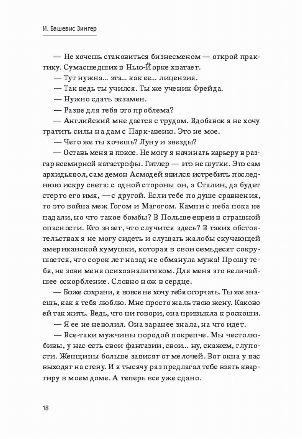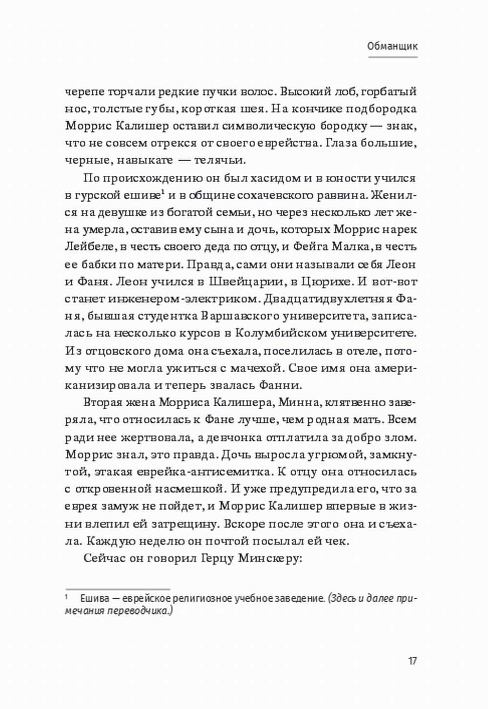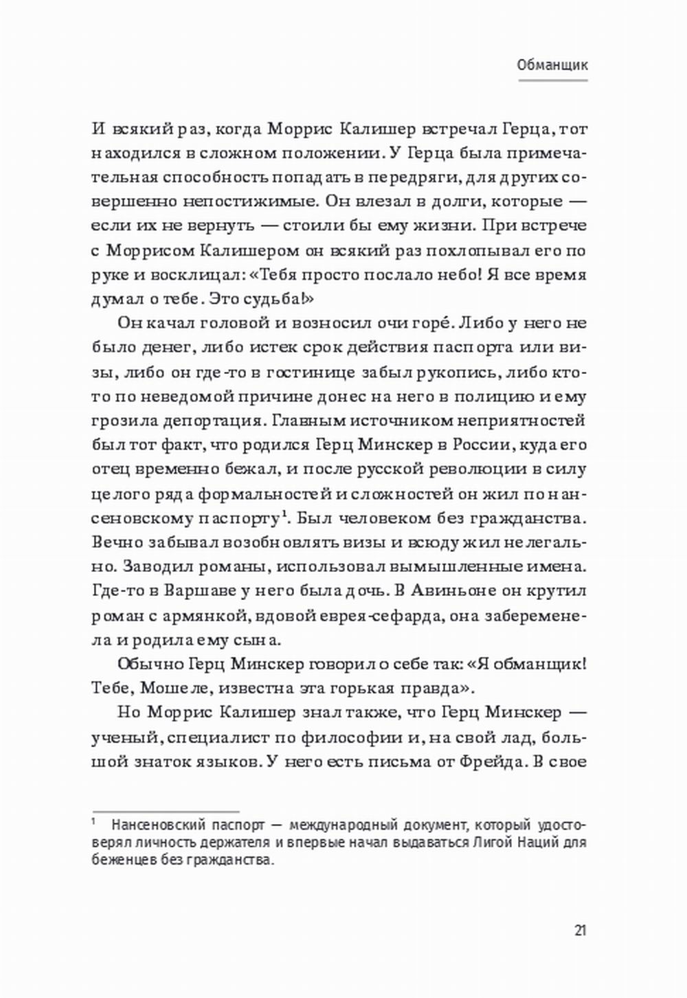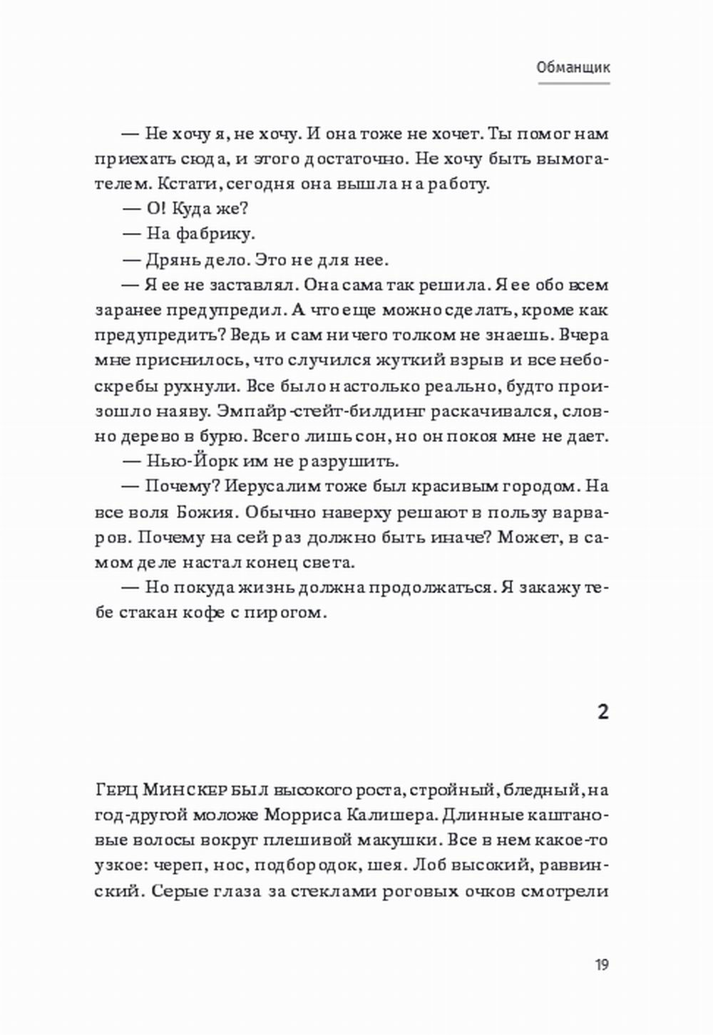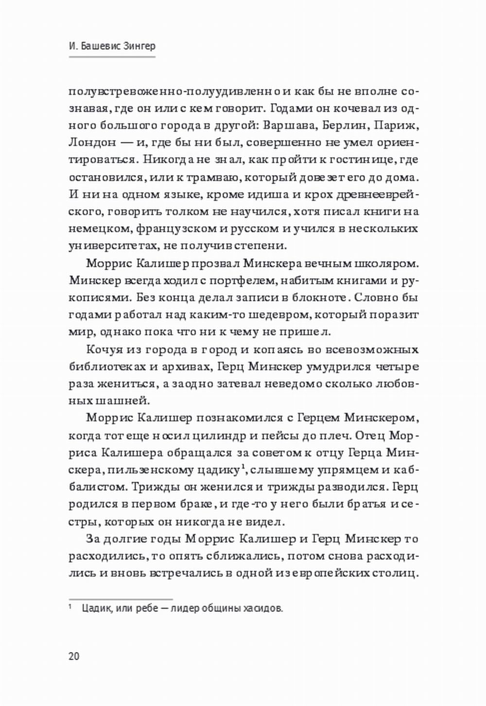 Америка 40-х, разгар Второй мировой войны. В центре сюжета - человек по имени Герц Минскер, самостийный гибрид философа-экзистенциалиста, религиозного мыслителя и теоретика психоанализа, отвергающий все категории в пользу того, что он именует «исследованием человека», - мешанины из размышлений о человечестве и его устремлениях. Минскер не может завершить ни одну начатую им книгу, однако же кое-кто из евреев-эмигрантов, говорящих, как и он, на идише, считает его гением-неудачником, заблудшей душой из прославленной раввинской семьи, ведь он постоянно тянет деньги из жены, друзей и подруг, но имеет потенциал стать великим человеком. Минскера окружают люди не менее заблудшие - лучший друг-бизнесмен, часто оказывающий ему финансовую поддержку, жена этого бизнесмена, поэтесса-графоманка, жаждущая пробиться в мире литературы на идише, спиритка-домохозяйка, которая ради Минскера устраивает фальшивые сеансы, и его жена, живущая в постоянной депрессии, оттого что оставила в Польше мужа и детей и сбежала с Герцем в Америку. Роман прослеживает поступки этих и других персонажей, меж тем как Минскер превращает их и без того непростую личную жизнь в полный хаос.| Издательство | Городец |