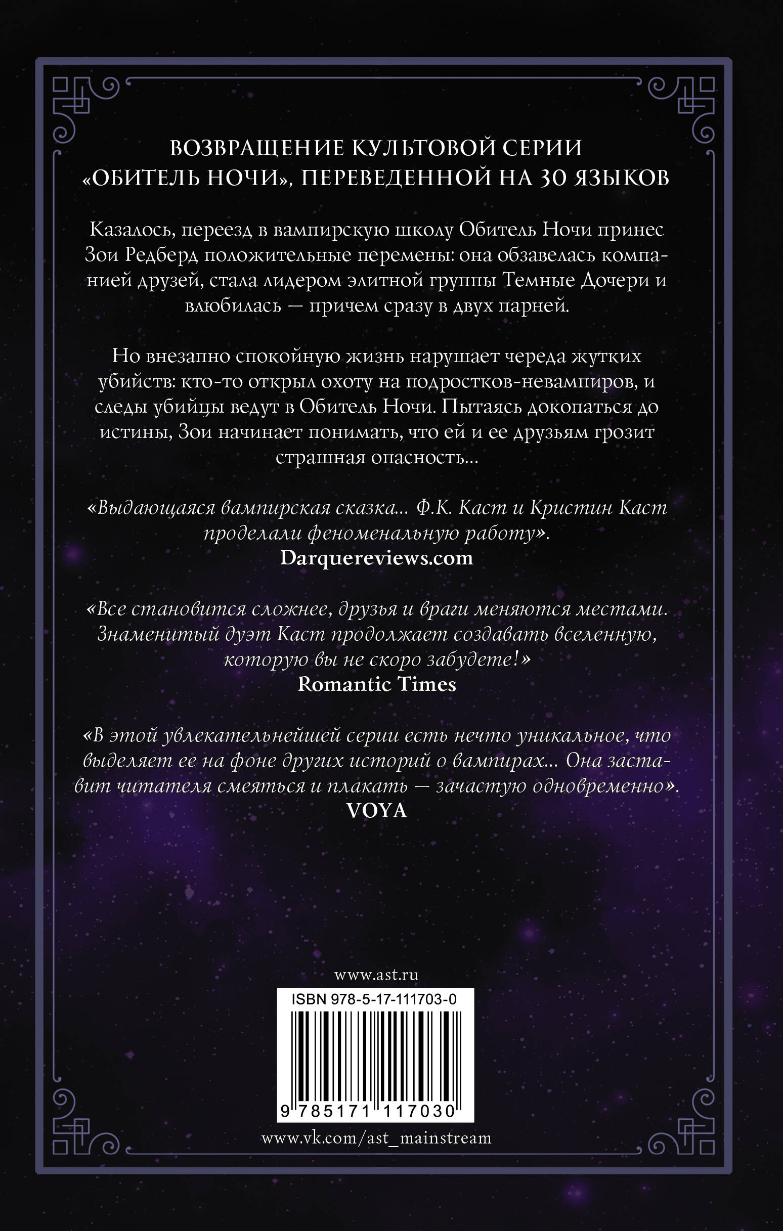 Казалось, переезд в вампирскую школу Обитель Ночи принес Зои Редберд положительные перемены: она обзавелась компанией друзей, стала лидером элитной группы Темные Дочери и влюбилась - причем сразу в двух парней. Но внезапно спокойную жизнь нарушает череда жутких убийств: кто-то открыл охоту на подростков-невампиров, и следы убийцы ведут в Обитель Ночи. Пытаясь докопаться до истины, Зои начинает понимать, что ей и ее друзьям грозит страшная опасность…| Издательство | ИЗДАТЕЛЬСТВО "АСТ" |