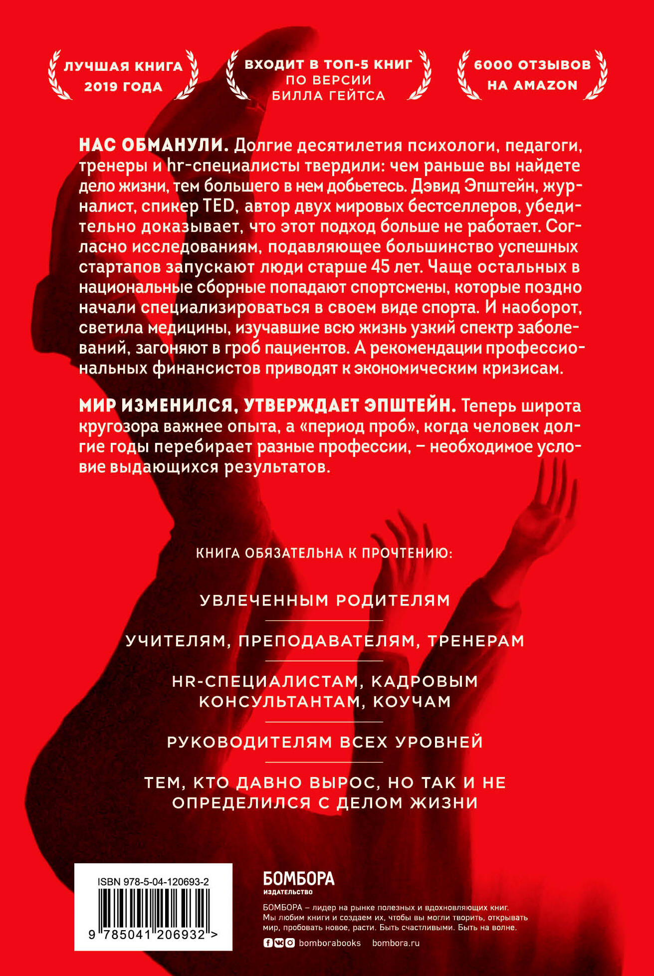 Нас обманули. Долгие десятилетия психологи, педагоги, тренеры и HR-специалисты твердили: чем раньше вы найдете дело жизни, тем больше в нем добьетесь. Дэвид Эпштейн, исследователь, журналист, спикер ТЭД, автор двух мировых бестселлеров, убедительно доказывает, что этот подход больше не работает. Согласно исследованиям, подавляющее большинство успешных стартапов запускает не молодежь, а люди старше 45 лет. Чаще остальных в национальные сборные попадают спортсмены, которые относительно поздно начали специализироваться в своем виде спорта. И, наоборот, светила медицины, изучавшие всю жизнь узкий спектр заболеваний, загоняют в гроб пациентов. А рекомендации суперпрофессиональных финансистов приводят к экономическим кризисам. Мир изменился, утверждает Эпштейн. Теперь широта кругозора важнее опыта, а «период проб», когда человек долгие годы перебирает разные профессии, - необходимое условие выдающихся результатов. Книга обязательна к прочтению: - увлеченным родителям; - школьным учителям, вузовским преподавателям, спортивным тренерам; - HR-специалисиам, кадровым консультантам, коучам; - руководителям всех уровней; - тем, кто давно вырос, но так и не определился с делом жизни.| Издательство | ООО "Издательство "Эксмо" |