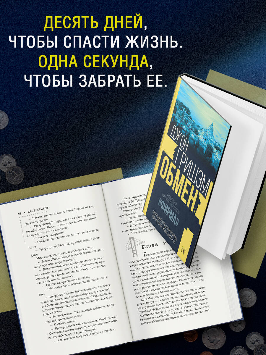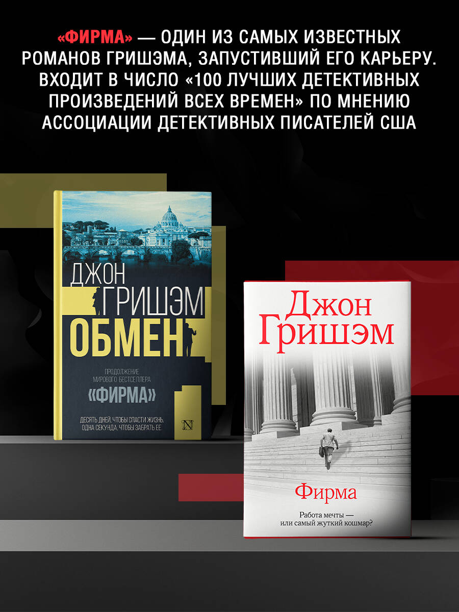- «Обмен» - продолжение «Фирмы», одного из ключевых романов Гришэма, который сделал его звездой юридического триллера и был экранизирован в Голливуде с Томом Крузом в главной роли. - Гришэм вновь сочетает интригу, основанную на реальных юридических и политических механизмах, с напряженным сюжетом: международное право, большие деньги, террористы, работа спецслужб и корпораций. - Роман понравится поклонникам интеллектуальных триллеров о законе, закулисной политике и людях, вынужденных принимать решения на грани.