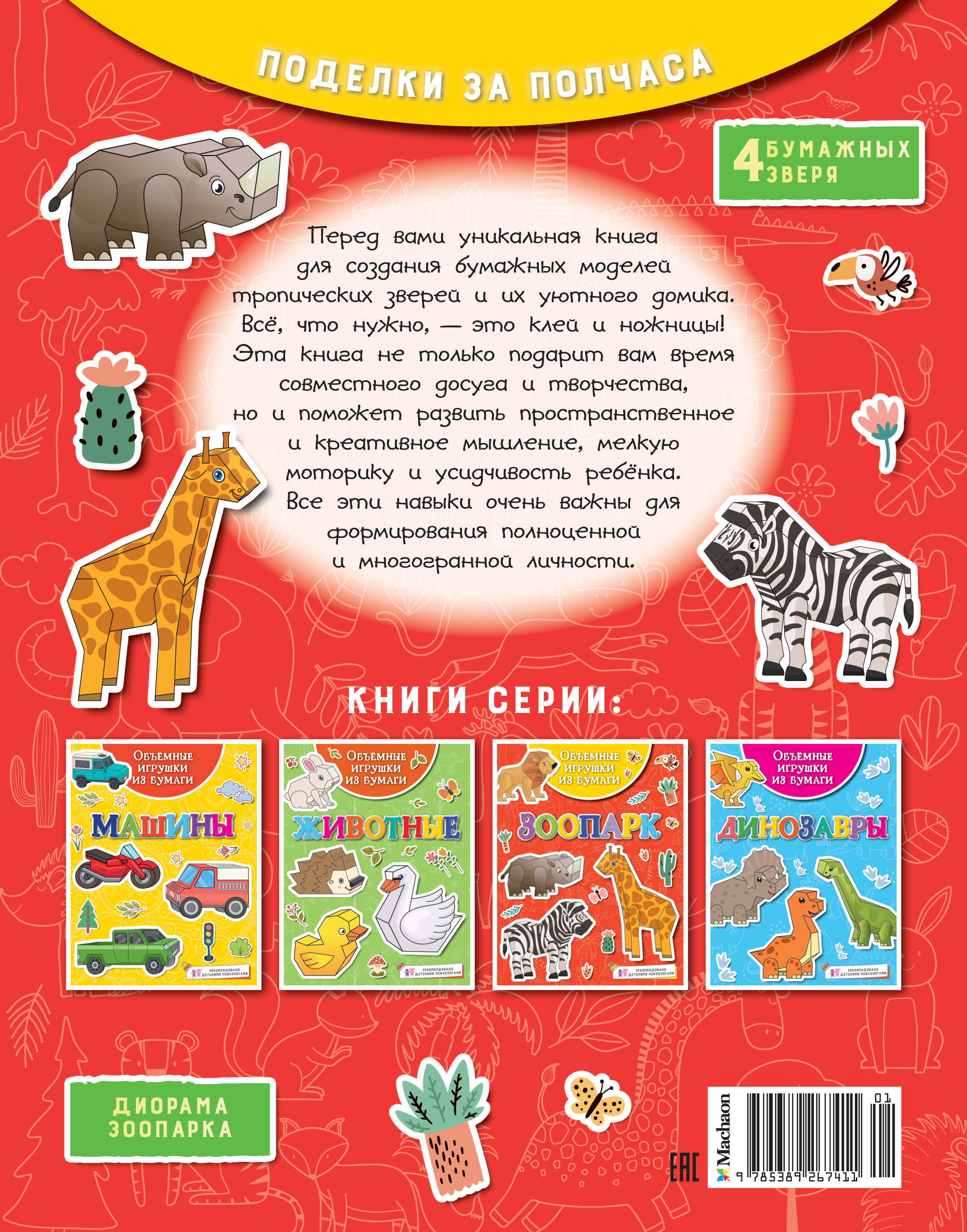 Перед вами уникальная книга для создания бумажных моделей тропических зверей и их уютного домика. Всё, что вам понадобится - это клей и ножницы! Эта книга не только подарит вам время совместного досуга и творчества, но и поможет развить пространственное и креативное мышление, мелкую моторику и усидчивость ребёнка. Все эти навыки очень важны для формирования полноценной и многогранной личности.| Издательство | Азбука-Аттикус Издат.группа ООО |
