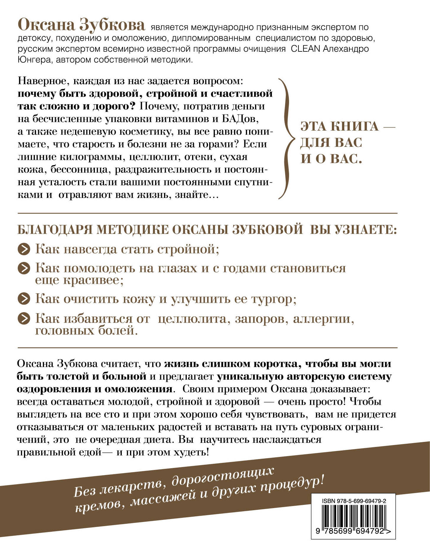 О чем эта книга Книга содержит описание авторской методики оздоровления, омоложения и похудения, а также доступные рекомендации для поддержания женского здоровья и сохранения молодости натуральным путем. Автор книги Оксана Зубкова - международно признанный эксперт по детоксу, похудению и омоложению, дипломированный специалист по здоровью Института интегрированного питания, член Американской ассоциации безлекарственного оздоровления. Для кого эта книга Эта книга для всех женщин, которые хотят всегда оставаться молодыми, стройными и здоровыми, а также выглядеть на все сто, и при этом хорошо себя чувствовать.| Издательство | ООО "Издательство "Эксмо" |
