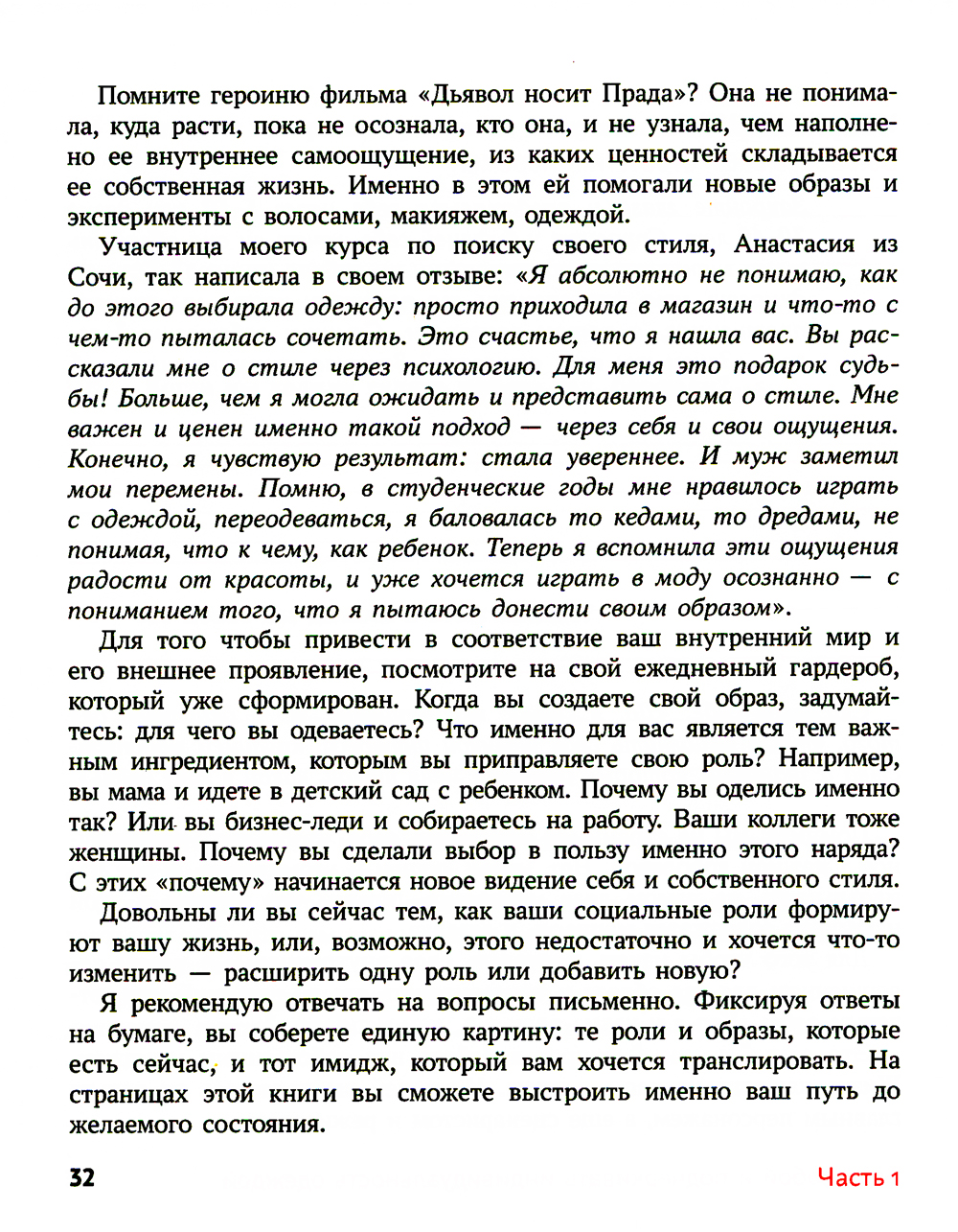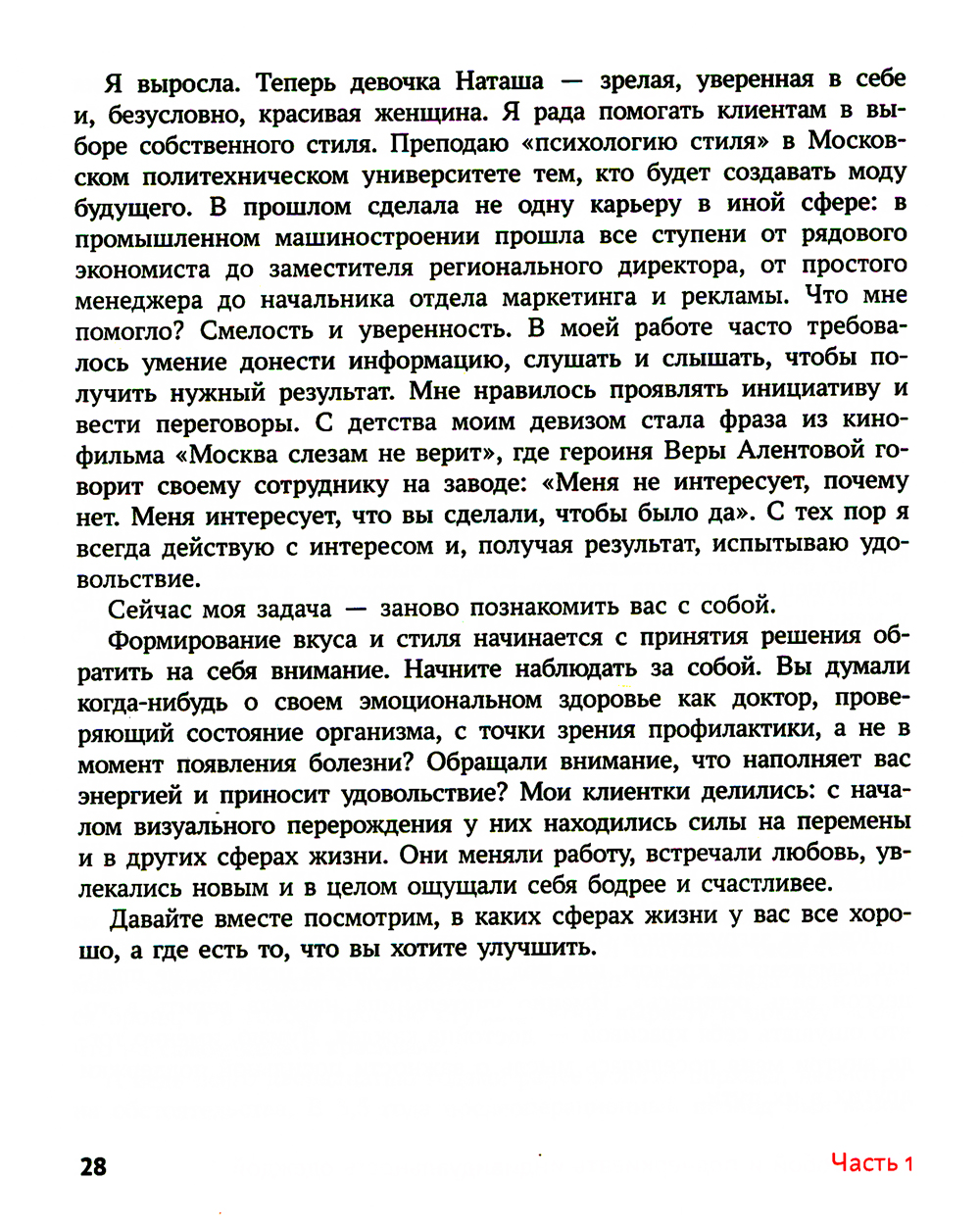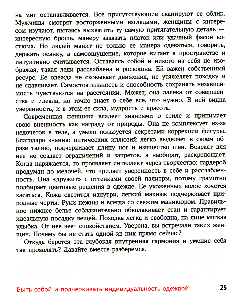 Как получать удовольствие от своего внешнего вида? Как самостоятельно подобрать уместный и комфортный образ, который придаст уверенности и поможет произвести нужное впечатление? Как легче строить карьеру или покорить сердце мужчины? Как с годами оставаться привлекательной и любить себя все сильнее? Как привить вкус дочке-подростку и при этом не испортить отношения, не задавить индивидуальность? С помощью практических упражнений вы определите свой стилевой психотип, нужную цветовую гамму и значение любимых оттенков, оцените эффект от подходящих вам причесок, макияжа и маникюра, научитесь управлять целостным впечатлением, получите знания о деталях - сумках, обуви, украшениях. И сформируете задачи вашего гардероба, чтобы он стал надежным союзником в достижении ваших жизненных целей. Книга - инструмент самопознания, позволяющий сформировать собственный стиль, изучить себя и самостоятельно составить образы для любого случая, в которых женщина будет чувствовать себя комфортно.
