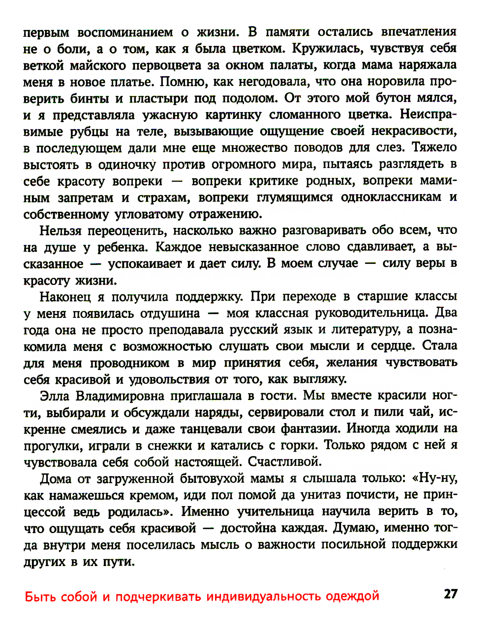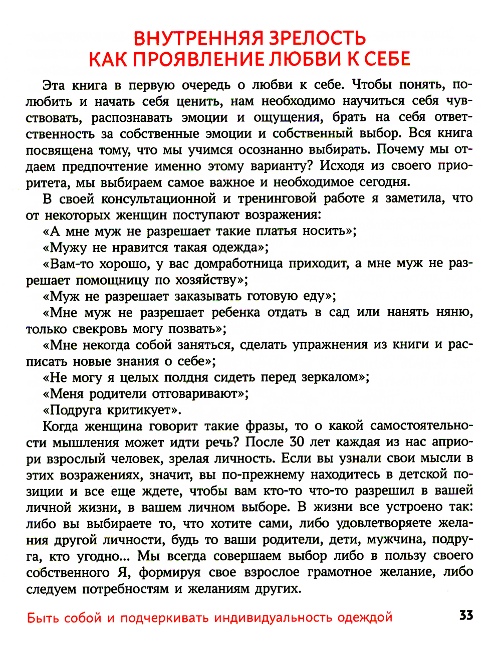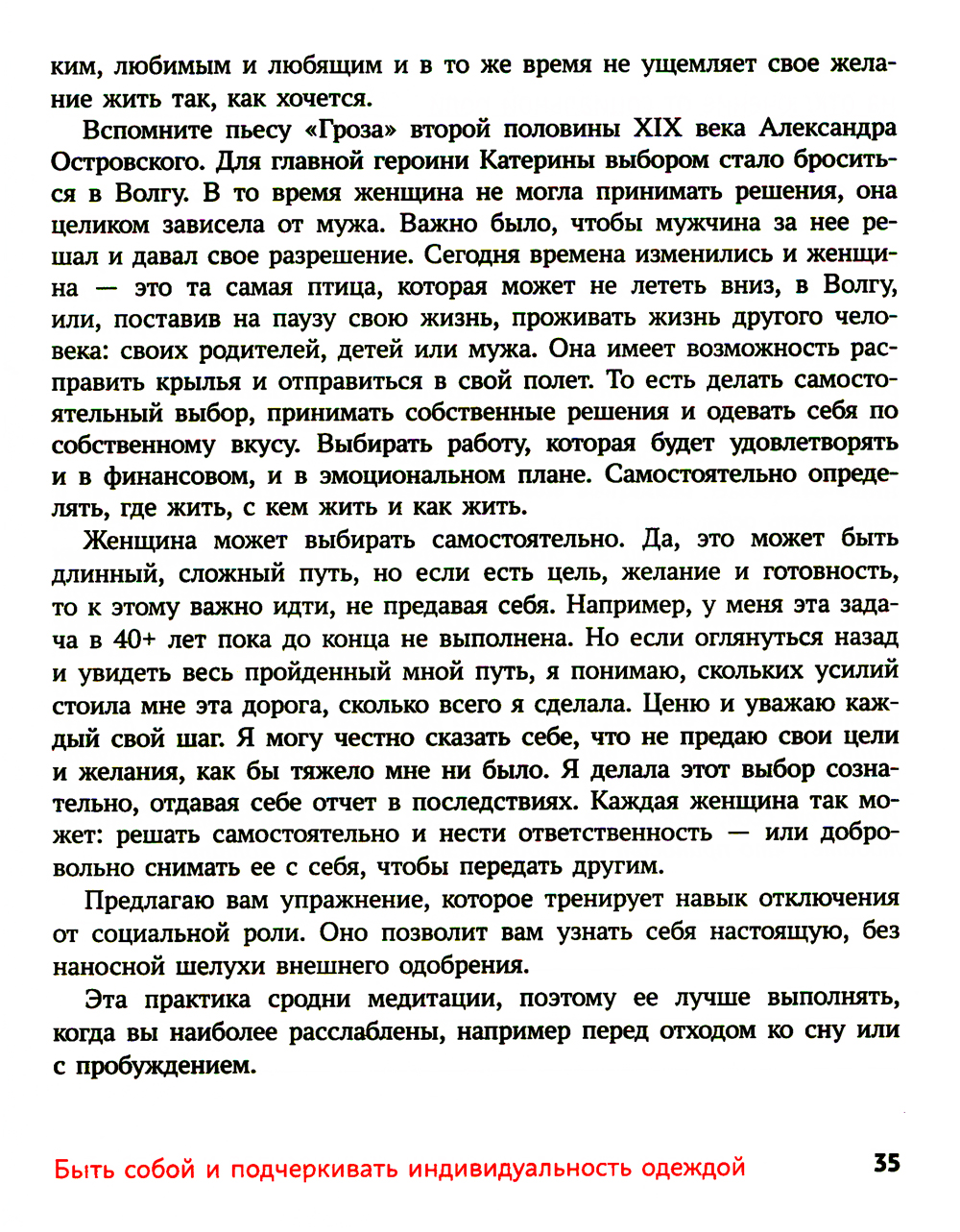 Как получать удовольствие от своего внешнего вида? Как самостоятельно подобрать уместный и комфортный образ, который придаст уверенности и поможет произвести нужное впечатление? Как легче строить карьеру или покорить сердце мужчины? Как с годами оставаться привлекательной и любить себя все сильнее? Как привить вкус дочке-подростку и при этом не испортить отношения, не задавить индивидуальность? С помощью практических упражнений вы определите свой стилевой психотип, нужную цветовую гамму и значение любимых оттенков, оцените эффект от подходящих вам причесок, макияжа и маникюра, научитесь управлять целостным впечатлением, получите знания о деталях - сумках, обуви, украшениях. И сформируете задачи вашего гардероба, чтобы он стал надежным союзником в достижении ваших жизненных целей. Книга - инструмент самопознания, позволяющий сформировать собственный стиль, изучить себя и самостоятельно составить образы для любого случая, в которых женщина будет чувствовать себя комфортно.