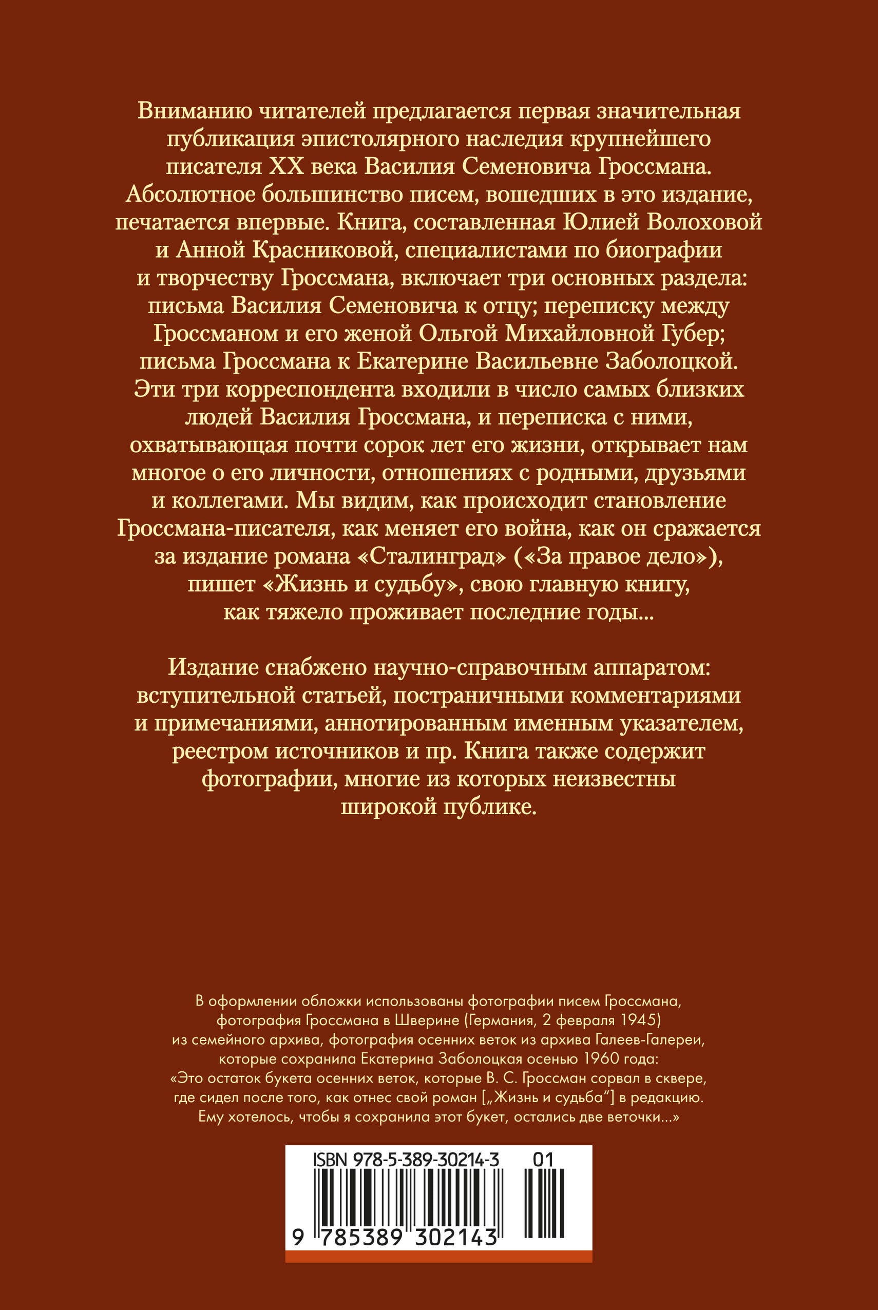 Это первая значительная публикация эпистолярного наследия крупнейшего советского писателя Василия Семеновича Гроссмана. Абсолютное большинство писем, вошедших в это издание, печатается впервые. Книга состоит из трех основных разделов: письма Василия Гроссмана к отцу Семену Осиповичу; переписка между Гроссманом и его женой Ольгой Михайловной Губер; письма Гроссмана к его последней любви, Екатерине Васильевне Заболоцкой. Три этих корреспондента входили в число самых близких людей Василия Гроссмана, и переписка с ними охватывает почти сорок лет его жизни. Эти письма открывают нам многое о личности Гроссмана, о его отношениях с родителями и детьми, с женщинами, которых он любил; мы узнаем о тех, кто был ему симпатичен и, наоборот, кто вызывал антипатию. Видим, как меняет Гроссмана война, как он сражается за издание романа «Сталинград» («За правое дело»), пишет «Жизнь и судьбу», свою главную книгу, как тяжело проживает последние годы... Издание снабжено научно-вспомогательным аппаратом, который включает вступительную статью, постраничные комментарии, аннотированный именной указатель, реестр архивных источников и др. Книга также содержит вклейку с фотографиями, многие из которых неизвестны широкой публике. Это издание адресовано как специалистам, изучающим жизнь и творчество В. Гроссмана, так и широкому кругу читатей, которые интересуются эпистолярным наследием классиков русской литературы.| Издательство | Издательство АЗБУКА ООО |