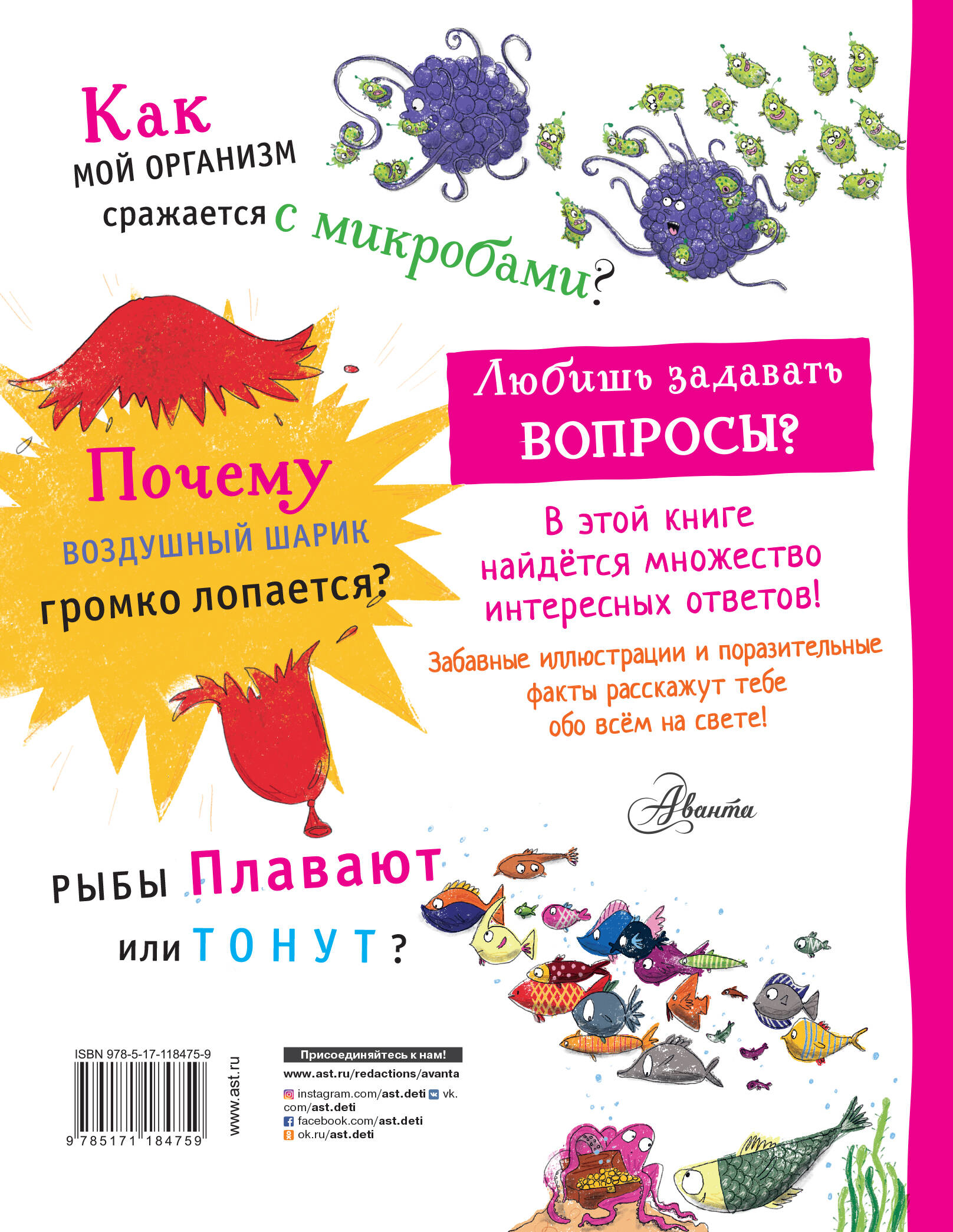 Как мой организм сражается с микробами? Почему воздушный шарик громко лопается? Рыбы плавают или тонут? Любишь задавать вопросы? В этой книге найдётся множество интересных ответов! Забавные иллюстрации и поразительные факты расскажут тебе обо всём на свете!| Издательство | ИЗДАТЕЛЬСТВО "АСТ" |