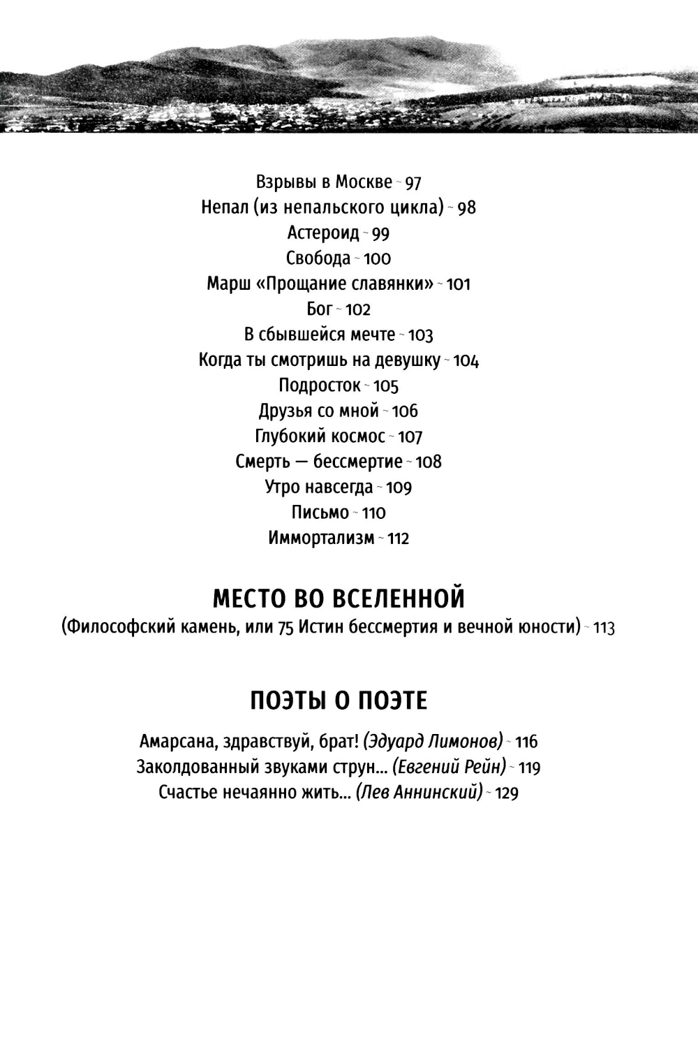 ЭДУАРД ЛИМОНОВ: «...Он принципиально не мелкий, не воспевает мелкую, профаническую общественно-личную обывательскую жизнь. ...он поёт о высоком, о Богах, о Духах, о предках, о Вселенных и Бездне Хаоса, хотя он его так не называет. Почти все песни его о высоком, и он позволяет себе только мелкие вкрапления современности, примет нашего дня, всякий раз чуть вышучивая их, стесняясь...», «...Я бы цитировал всю книжку...» ЕВГЕНИЙ РЕЙН: «Он... создал для себя свою собственную, особую поэтическую систему, по существу не имеющую аналогов ни в современной русской поэзии, ни в мировой». «Вот и эту книгу хочется всю, до конца прочитать, и если Бог даст памяти, выучить наизусть». ЛЕВ АННИНСКИЙ: «Планета Земля -вот настоящий лирический герой Амарсаны. Изначально и окончательно.«Как черновик с динозаврами эта планет». Мы-наследники. Всё мироздание вмещается «в зрачок глаза». «Сорок сороков скоплений галактик и бездн соринкой в глазу свербят». И глаз всё это вмещает».| Издательство | Выргород |