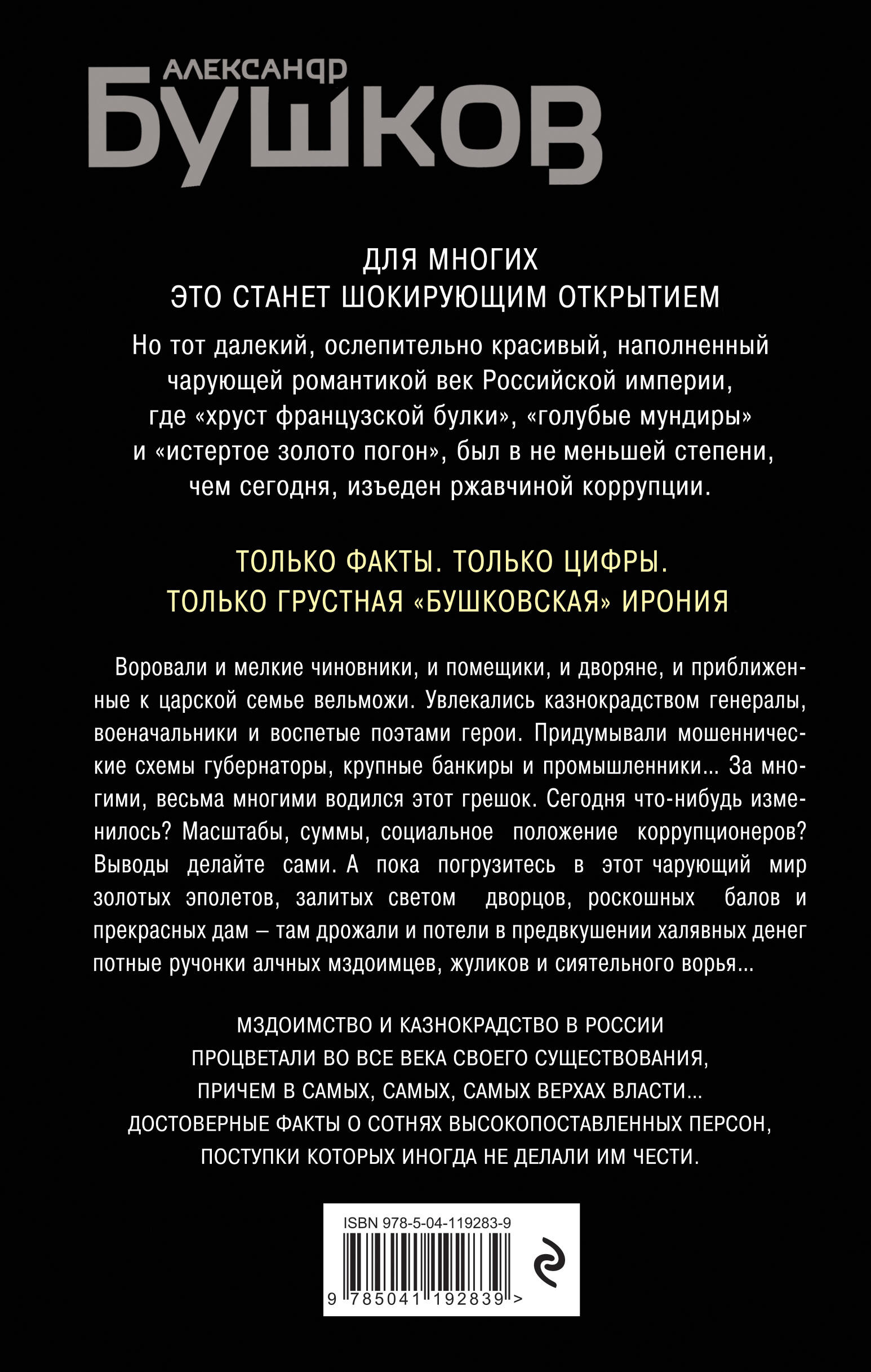Для многих это станет шокирующим открытием. Но тот далекий, ослепительно красивый, наполненный чарующей романтикой век российской империи, где «хруст французской булки», «голубые мундиры» и «истертое золото погон», был не в меньшей степени, чем сегодня, изъеден ржавчиной коррупции. Только факты. Только цифры. Только грустная ирония. Мздоимство и казнокрадство в России процветали во все века своего существования, причем в самых, самых, самых верхах власти… ______________ Коррупция - штука въедливая, заразная и многолетняя. Истребить ее подчистую до сих пор не удалось ни одному правителю в мире. Россия, разумеется, в этом плане не сильно отличается от остальных. В самых древних исторических документах, произведениях искусства, живописи и литературы, дошедших до нас, можно при желании обнаружить признаки этой бессмертной заразы. Воровали и мелкие чиновники, и помещики, и дворяне, и приближенные к царской семье вельможи. Увлекались казнокрадством генералы, военачальники и воспетые поэтами герои. Придумывали мошеннические схемы губернаторы, крупные банкиры и промышленники… За многими, весьма многими водился этот грешок. Сегодня что-нибудь изменилось? Масштабы, суммы, социальное положение коррупционеров? Выводы делайте сами. А пока - погрузитесь в этот чарующий мир золотых эполетов, залитых светом дворцов, роскошных балов и прекрасных дам - там! там дрожали и потели в предвкушении халявных денег потные ручонки алчных мздоимцев, жуликов и сиятельного ворья…| Издательство | ООО "Издательство "Эксмо" |