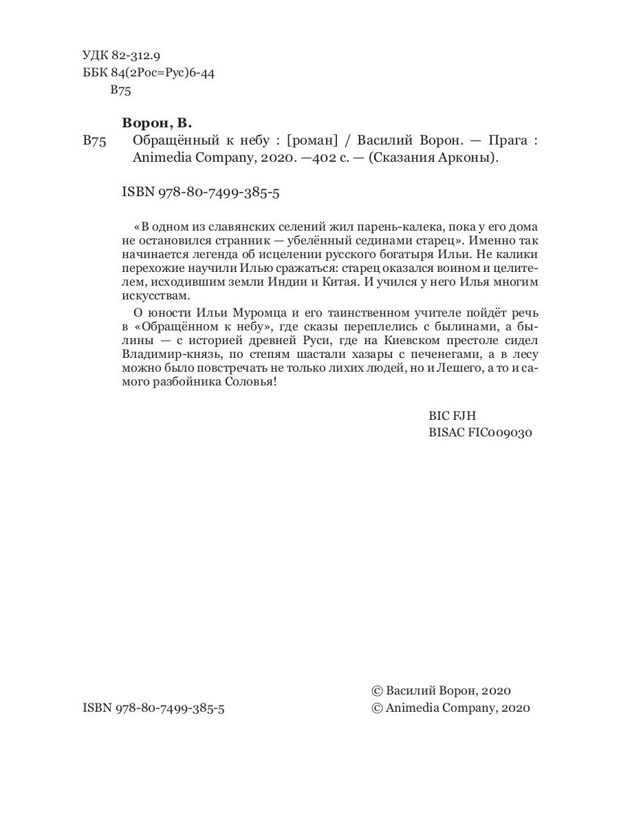 «В одном из славянских селений жил парень-калека, пока у его дома не остановился странник - убелённый сединами старец». Именно так начинается легенда об исцелении русского богатыря Ильи. Не калики перехожие научили Илью сражаться: старец оказался воином и целителем, исходившим земли Индии и Китая. И учился у него Илья многим искусствам. О юности Ильи Муромца и его таинственном учителе пойдёт речь в «Обращенном к небу», где сказы переплелись с былинами, а былины - с историей древней Руси, где на Киевском престоле сидел Владимир-князь, по степям шастали хазары с печенегами, а в лесу можно было повстречать не только лихих людей, но и Лешего, а то и самого разбойника Соловья!| Издательство | Т8 RUGRAM |