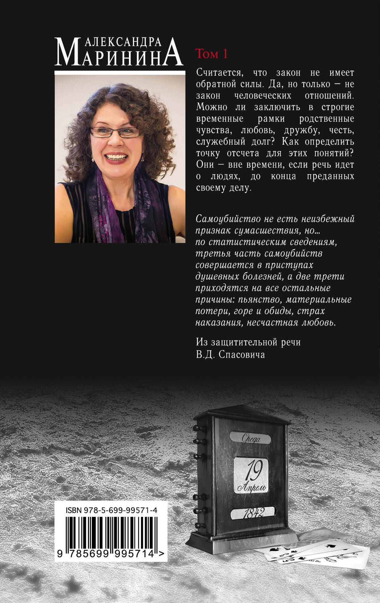 Считается, что закон не имеет обратной силы. Да, но только - не закон человеческих отношений. Можно ли заключить в строгие временные рамки родственные чувства, любовь, дружбу, честь, служебный долг? Как определить точку отсчета для этих понятий? Они - вне времени, если речь идет о людях, до конца преданных своему делу. Самоубийство не есть неизбежный признак сумасшествия, но… по статистическим сведениям, третья часть самоубийств совершается в приступах душевных болезней, а две трети приходятся на все остальные причины: пьянство, материальные потери, горе и обиды, страх наказания, несчастная любовь. Из защитительной речи В.Д.Спасовича «Маринина не только пишет детективные романы, но и отвечает на вечные вопросы. Автор относится к своим читателям как добрый и опытный учитель к ученикам, которые нуждаются в поддержке, подсказке и направлении на верный путь. Оптимистичная и практичная в своей дидактике, Маринина ставит перед собой вопрос "как жить" и старается помочь читателю найти свой путь к лучшей жизни в сегодняшнем мире. Своими детективами Маринина пишет современный роман "воспитания чувств": основная цель автора - воспитание посредством развлечения». - Анатолий Вишевский, Гринелльский колледж, США «Многие романы Александры Марининой в России экранизированы, а в Германии переработаны в радиопьесы. Исходя из того, что цель этих обработок - захватывать зрителей и слушателей таким же образом, как захвачены читатели, то фильм и радиопьеса являются не только дополнительными художественными произведениями, но и интересными интерпретациями, которые проникли в тайну успеха Александры Марининой». - Сара Хэги, Кельнский университет, Германия «В диалогах художественной и тривиальной литературы можно обнаружить разные способы стилизации "устности", чтобы достичь впечатления спонтанного разговора. Обиходная речь в романах А. Марининой отличается необыкновенно высокой степенью оживленности, что выражается, между прочим, в разных формах обращения собеседников, в различных оттенках вежливости и в эмоциональности используемой лексики». - Вольфганг Штадлер, Университет имени Леопольда Францена, Инсбрук, Австрия| Издательство | ООО "Издательство "Эксмо" |