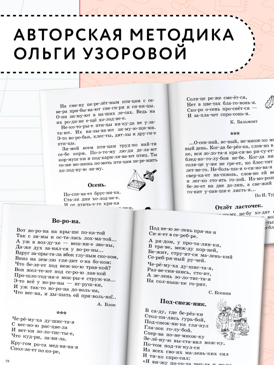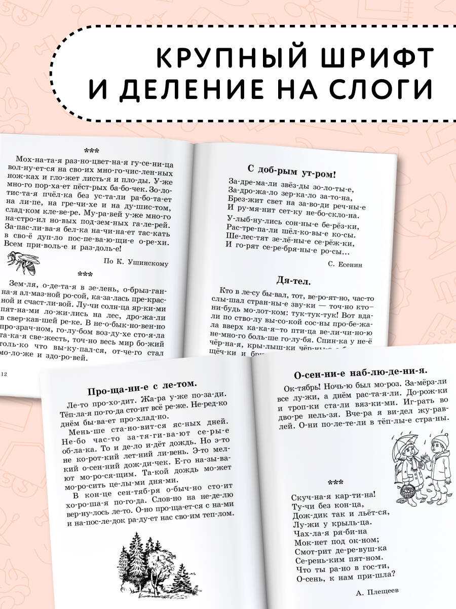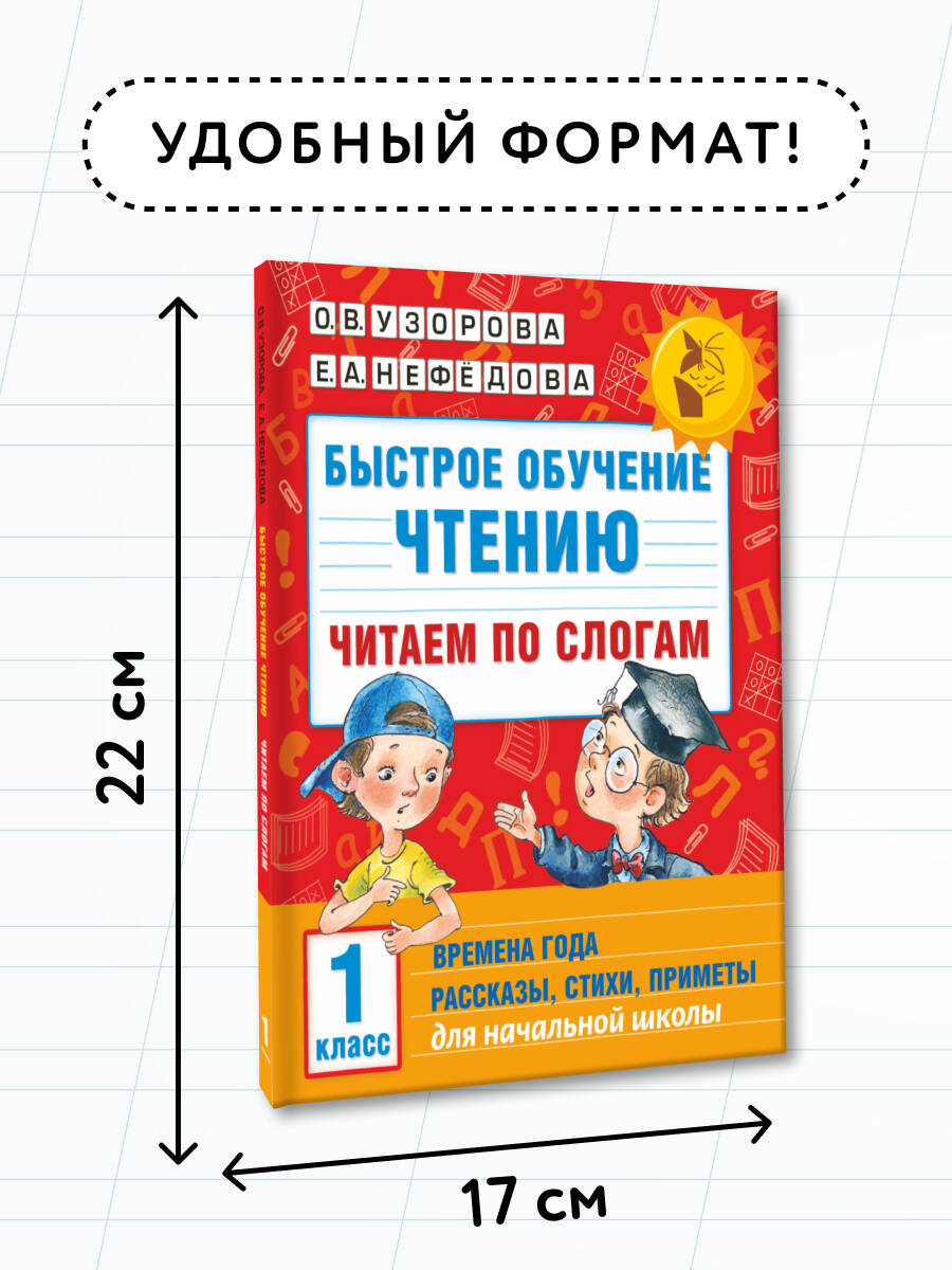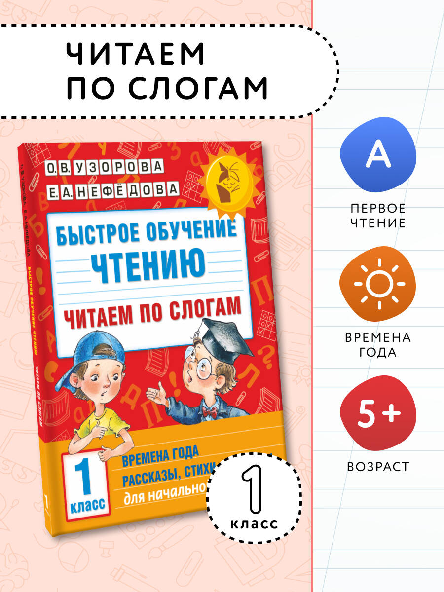 В пособие известных педагогов-практиков, авторов самых издаваемых учебников и учебных пособий в России О.В. Узоровой и Е.А. Нефёдовой включены познавательные рассказы, стихотворения, приметы, пословицы, поговорки, посвященные временам года. Особенностью издания является крупный шрифт и графическая разбивка на слоги, которая обеспечивает целостность восприятия слов в процессе чтения и помогает ребенку прочитать слова повышенной сложности. Книгу можно использовать на уроках обучения грамоте, а также для самостоятельных занятий дома.| Издательство | ИЗДАТЕЛЬСТВО "АСТ" |