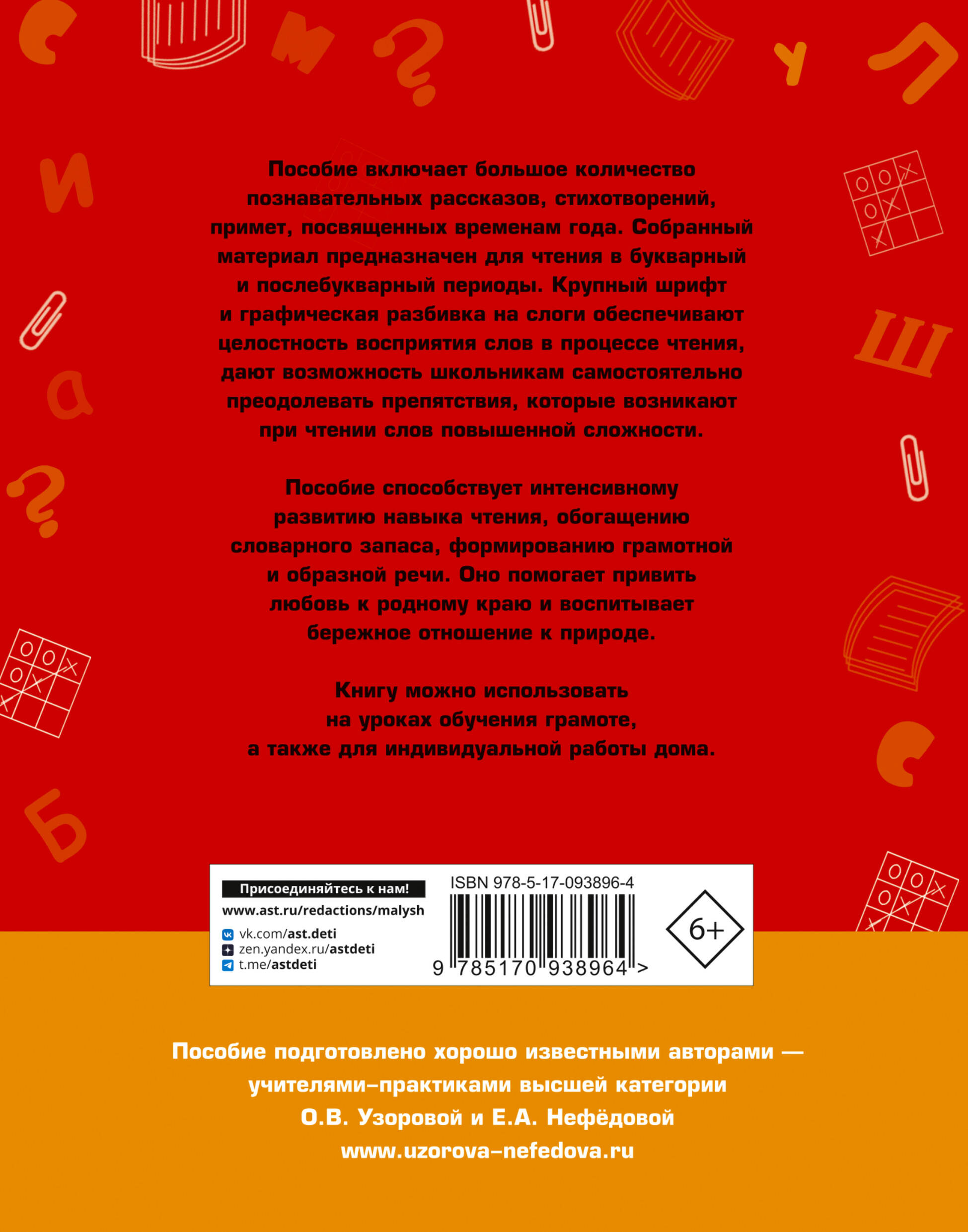В пособие известных педагогов-практиков, авторов самых издаваемых учебников и учебных пособий в России О.В. Узоровой и Е.А. Нефёдовой включены познавательные рассказы, стихотворения, приметы, пословицы, поговорки, посвященные временам года. Особенностью издания является крупный шрифт и графическая разбивка на слоги, которая обеспечивает целостность восприятия слов в процессе чтения и помогает ребенку прочитать слова повышенной сложности. Книгу можно использовать на уроках обучения грамоте, а также для самостоятельных занятий дома.| Издательство | ИЗДАТЕЛЬСТВО "АСТ" |