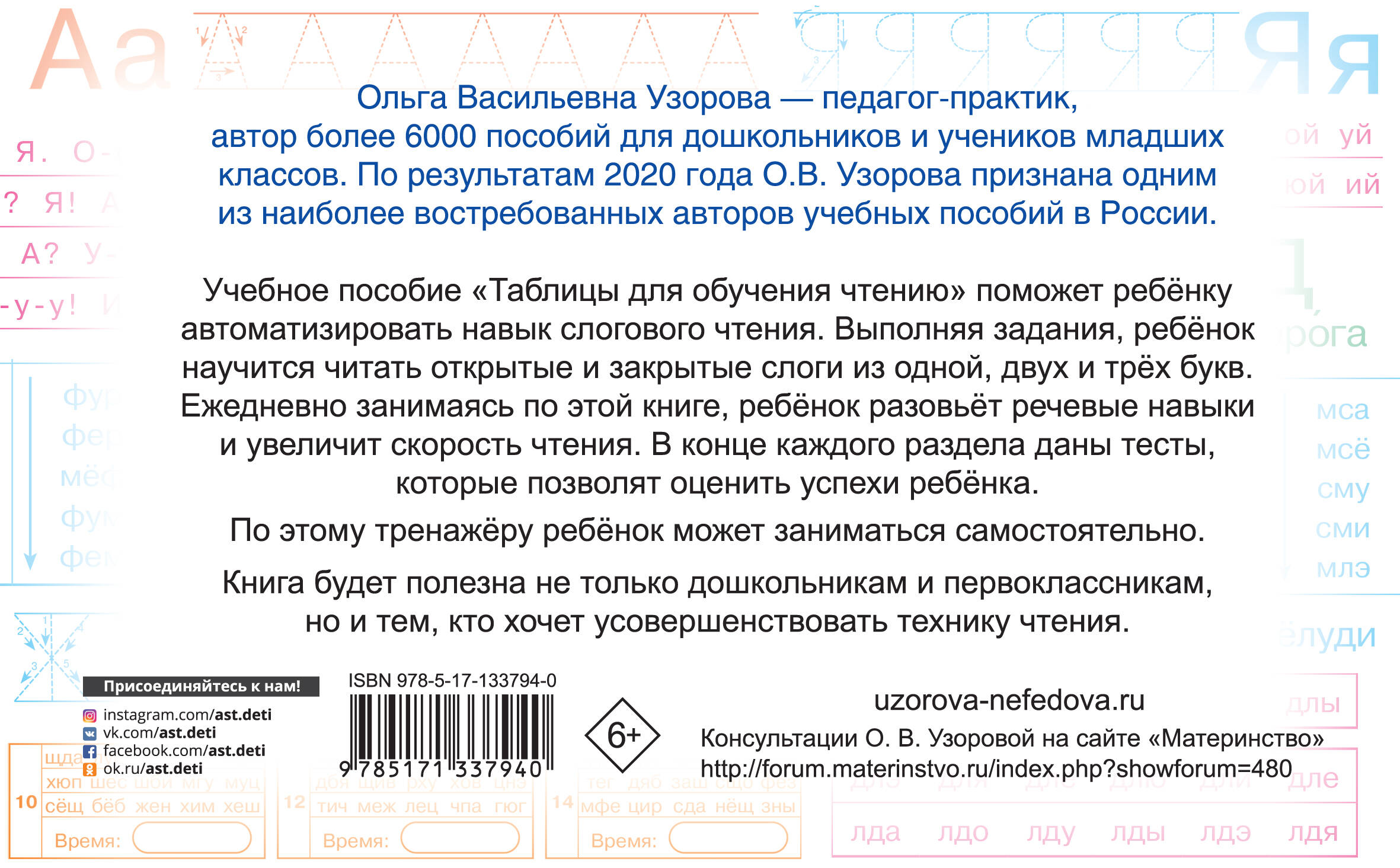 О чем эта книга Учебное пособие известных педагогов-практиков О. В. Узоровой и Е. А. Нефёдовой поможет ребёнку автоматизировать навык слогового чтения. Кому эта книга будет интересна Отличное пособие для учащихся начальной школы. Каковы особенности этой книги • Слоговому чтению отводится важная роль в освоении навыков чтения. • Ребёнок научится читать открытые и закрытые слоги из одной, двух и трех букв. • Ежедневно занимаясь по этой книге, ребёнок разовьёт речевые навыки и увеличит скорость чтения. • По этому тренажёру ребёнок может заниматься самостоятельно. • Книга будет полезна не только дошкольникам и первоклассникам, но и тем, кто закончил первый класс, но хочет усовершенствовать технику чтения.| Издательство | ИЗДАТЕЛЬСТВО "АСТ" |